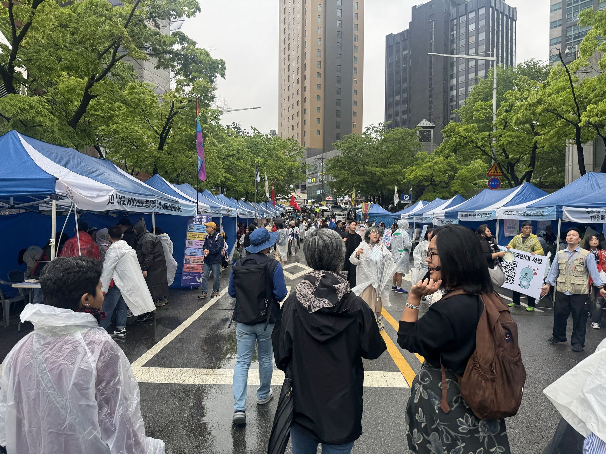 虽然下着雨,但各工会、团体准备的可一点都不马虎。道路两旁早早架好了帐棚,让各工会、团体摆摊,让大家参与各项议题与连署。经过的群众、民众纷纷在各个摊位前驻足。只可惜我不会韩文,虽然努力的用手机上Google翻译的照片模式,勉强的凑合着理解一些标语、文宣和旗帜,但还是只能稍稍略窥一二。