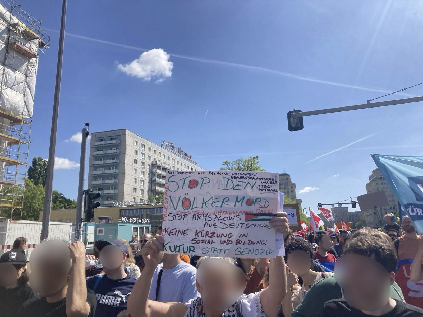 我们还遇到了“工会支持加沙”Gewerkschafter:innen 4 Gaza的行动者,在游行上发传单。ta们对我们说,在德国,巴勒斯坦问题和劳工问题不能分开讨论,政府对种族屠杀的支持与对内的“威权转型”息息相关。过去一年,ta们一直在试图动员更多的工会成员参与巴勒斯坦团结行动,反对对以色列的武器运输,督促工会官方放弃对以色列无条件无底线的支持。德国生活着75万巴勒斯坦人,占全部人口近1%。一年多来,政府对巴勒斯坦团结运动的打压,也让不少劳动者被噤声甚至失去工作(政府承包商员工、电商平台Zalando),而工会对ta们没有过任何支持。与我们聊天的参与者认为,这次工会没有禁止ta们发传单,已经较之前是一个进步了。