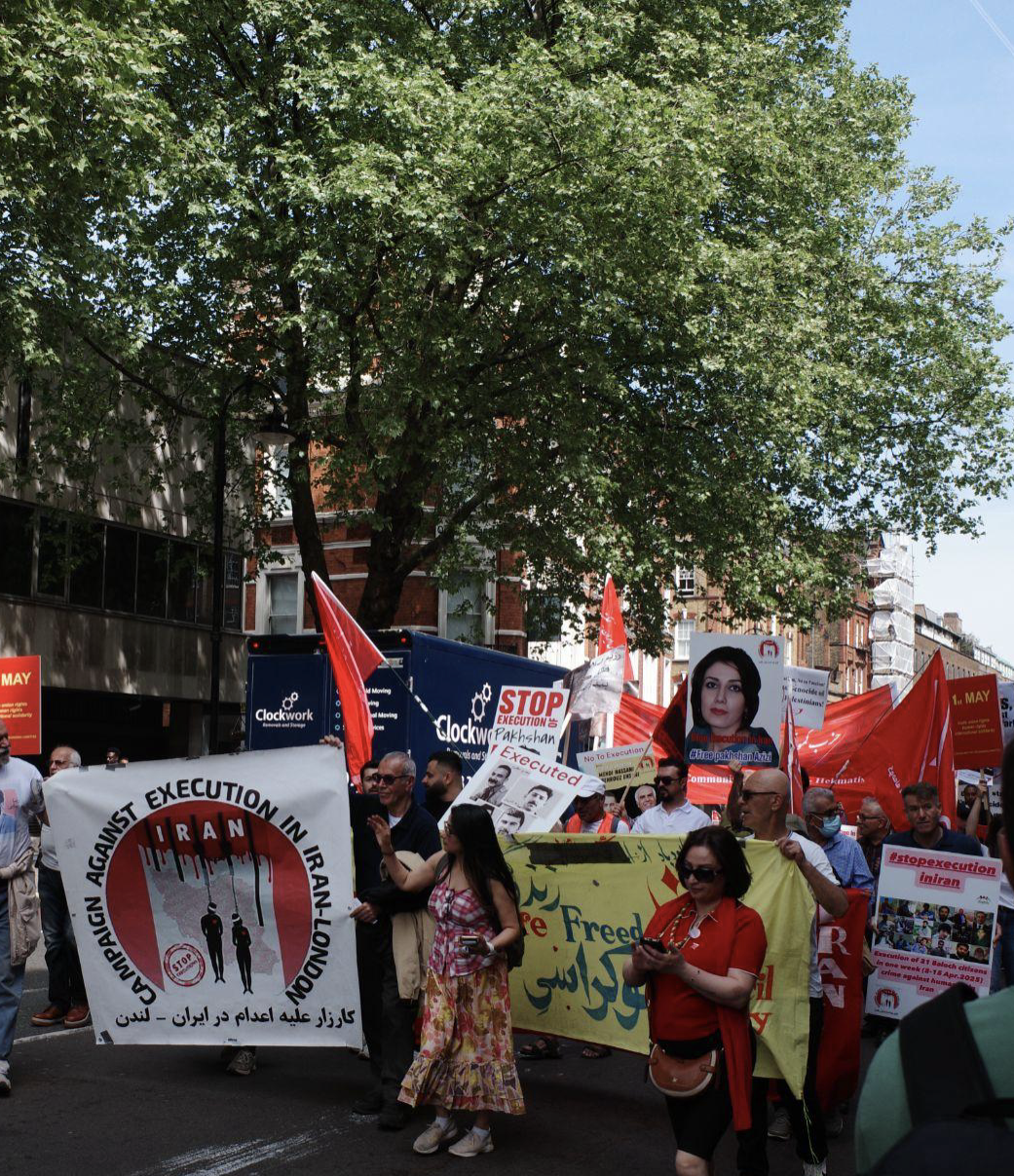 伦敦的五一游行由 London May Day Organizing Committee 主办,集合点设在克勒肯维尔区的马克思纪念图书馆前,从附近人流量最大的Farringdon车站步行至现场的路上,不时有人分发游行邀请与呼吁“停止加沙暴行”的传单,但并没有太多路人抱有兴趣。准备区域设有多个劳工主题的独立出版书摊,现场也有很多出版人员在推介读物,例如《A Spartacist Publication》,介绍各国工人抗争、政治迫害与殖民历史。