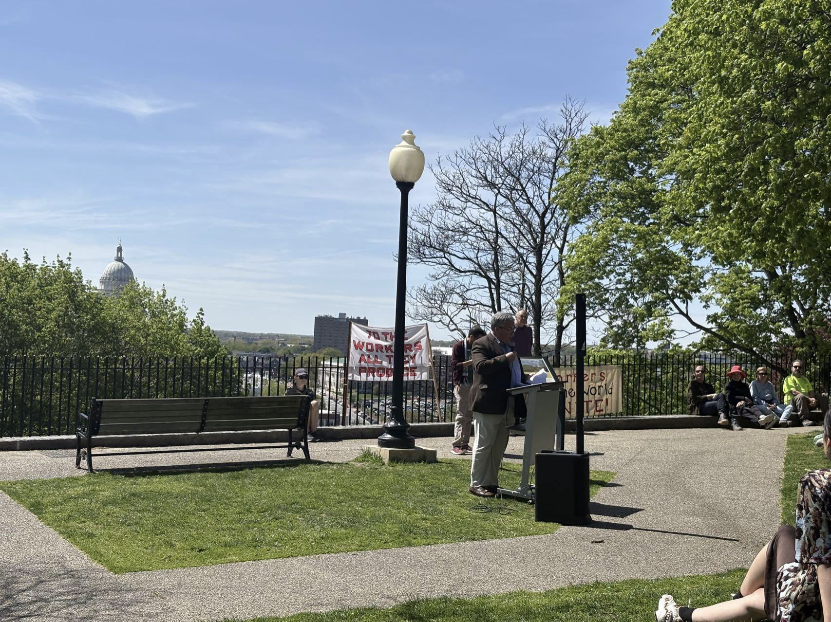 五一集会设置在城市高处的公园里,各个工会与劳工组织齐聚,各自搭起展位,并依次来到集会的人群前宣讲。前来集会的组织包括本地高校校园职工工会、教师与卫生职工联合工会(Federation of Teachers and Health Professionals)、护士及相关职工联合工会(United Nurses and Allied Professionals - UNAP)、美国高校教授联合会(American Association of University Professors - AAUP)、社会主义解放党(Party for Socialism and Liberation - PSL)、美国社会主义民主党(Democratic Socialists of America - DSA)等。