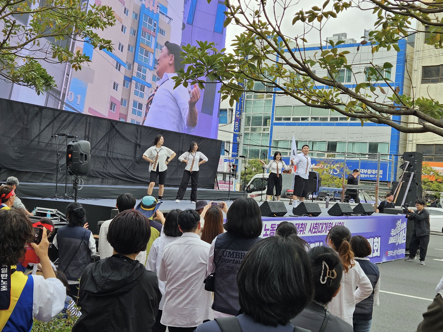 这种隐患也反映在釜山本次的世界劳动节大会上。除了民主劳总歌和光州之歌之外,传统的工人歌曲如罢业歌、钢铁劳动者、旗帜歌等等都没能上台。反之,改编了歌词的K-POP歌曲,甚至K-POP原曲则登上了劳动节大会的舞台。对此,似乎也并不是所有工人群众都买账。有些工人对流行文化不以为然,也有极少数激进的左派干部担心一般大众的涌入反而稀释了劳组的斗争性。从民主劳总首脑部提出的口号和斗争方向逐渐与主流政治趋同这一点来看,这样的担忧也不无道理。