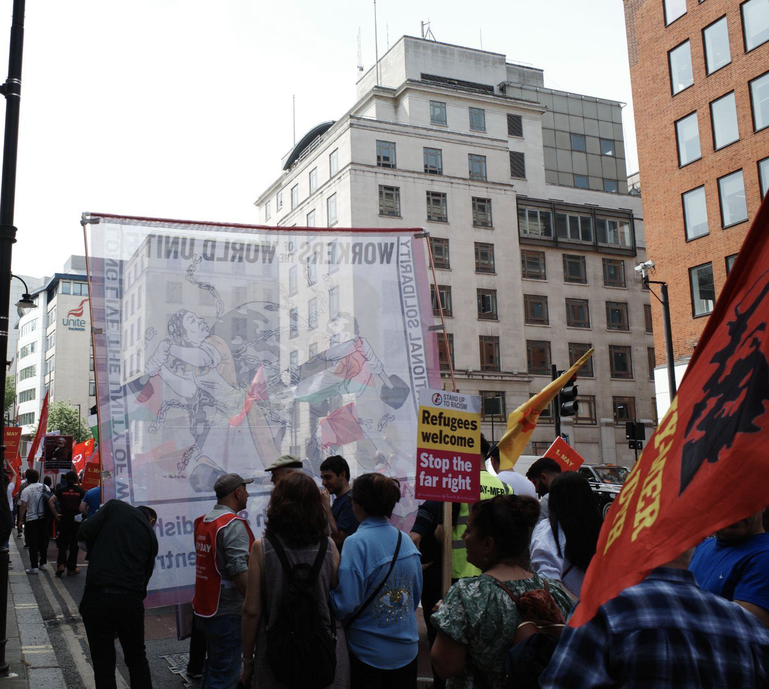 队伍于下午一点启程,横跨伦敦市中心街区,一路行进至特拉法加广场。参与组织包括本地大型工会(如铁路工会 RMT)、移民权益团体、女性劳工组织,以及来自伊朗、叙利亚、土耳其、乌克兰、拉丁美洲与东南亚等政团。整个游行由多样化的诉求构成,例如同工同酬、无罪释放被捕工人与政治人士、反对排外政策、公交司机的工时与工资保障等。尽管诉求繁多,整场游行仍以两大主题最为突出:一是声援巴勒斯坦、反对战争暴行;二是反对全球资本主义体系,对川普再度掌权下重塑世界秩序的表达高度警惕。