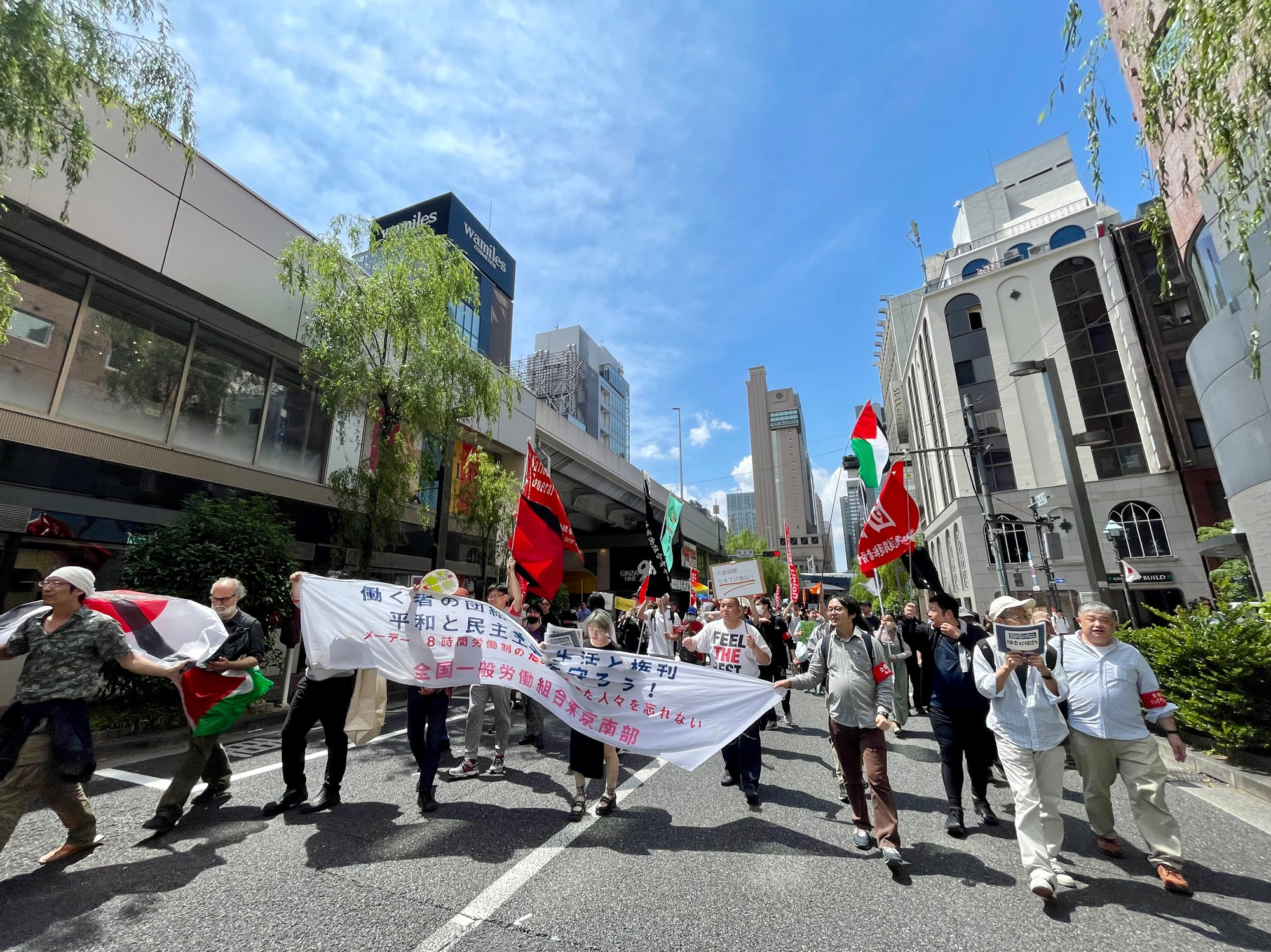 集会后,上午11时许,人们从日比谷公园分两路出发,向银座和新桥方向进行游行,途径日本中央政府部门大楼和繁华的商业街,游行时长约30分钟。除了工会旗帜,大家还拿出自制横幅和标语牌,一起呼喊口号。