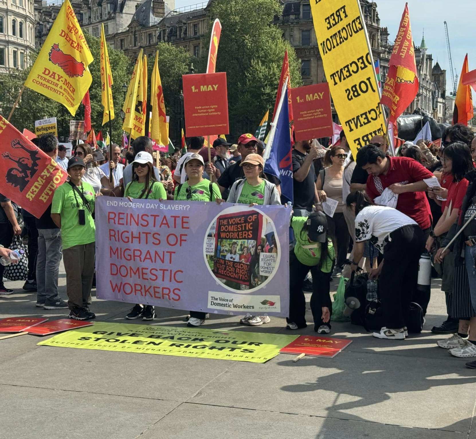 由2020年开始,今年是第六年没有再举办五一大游行。剩下的是少数团体在政府总部外举行请愿活动,以及在城市内不同角落举办的小型街站。2025年,在5月1日劳动节当天,在政府总部举行请愿的团体只有社会民主连线。除此以外,在五一的前一个星期天,即4月27日,香港妇女劳工协会(女工会)也在政府总部外举行请愿活动。4月28日,以工殇纪念日的名义,工业伤亡权益会在政府总部外举行了工殇者纪念活动。五一的后一个星期天,即5月4日,其中一个移民家务工工会组织 Asian Migrants Coordinating Body 也在政总门外举行了请愿活动。为了多了解现在硕果仅存的劳工团体现况,我们与女工会总干事胡美莲女士进行了简单访问。