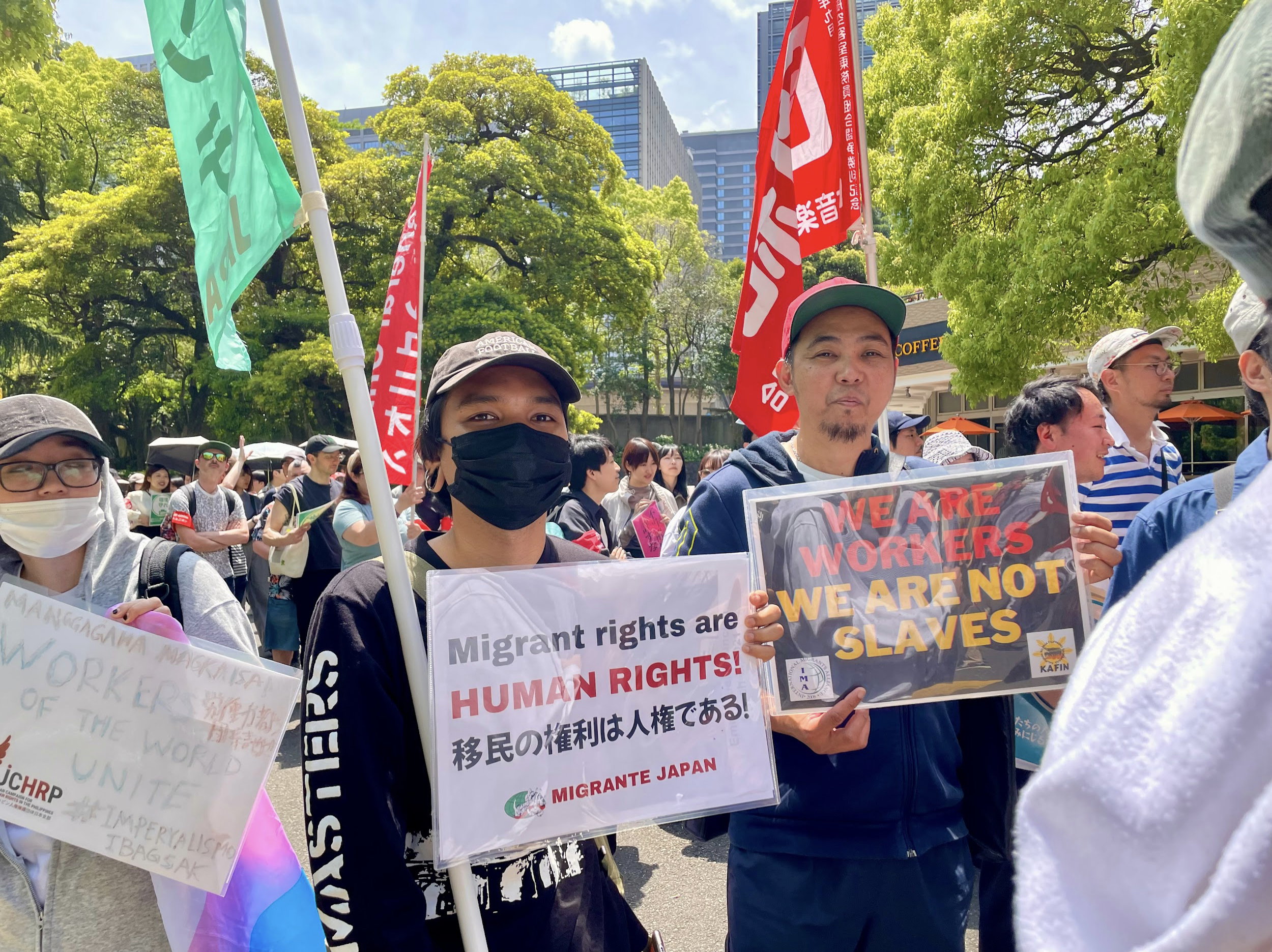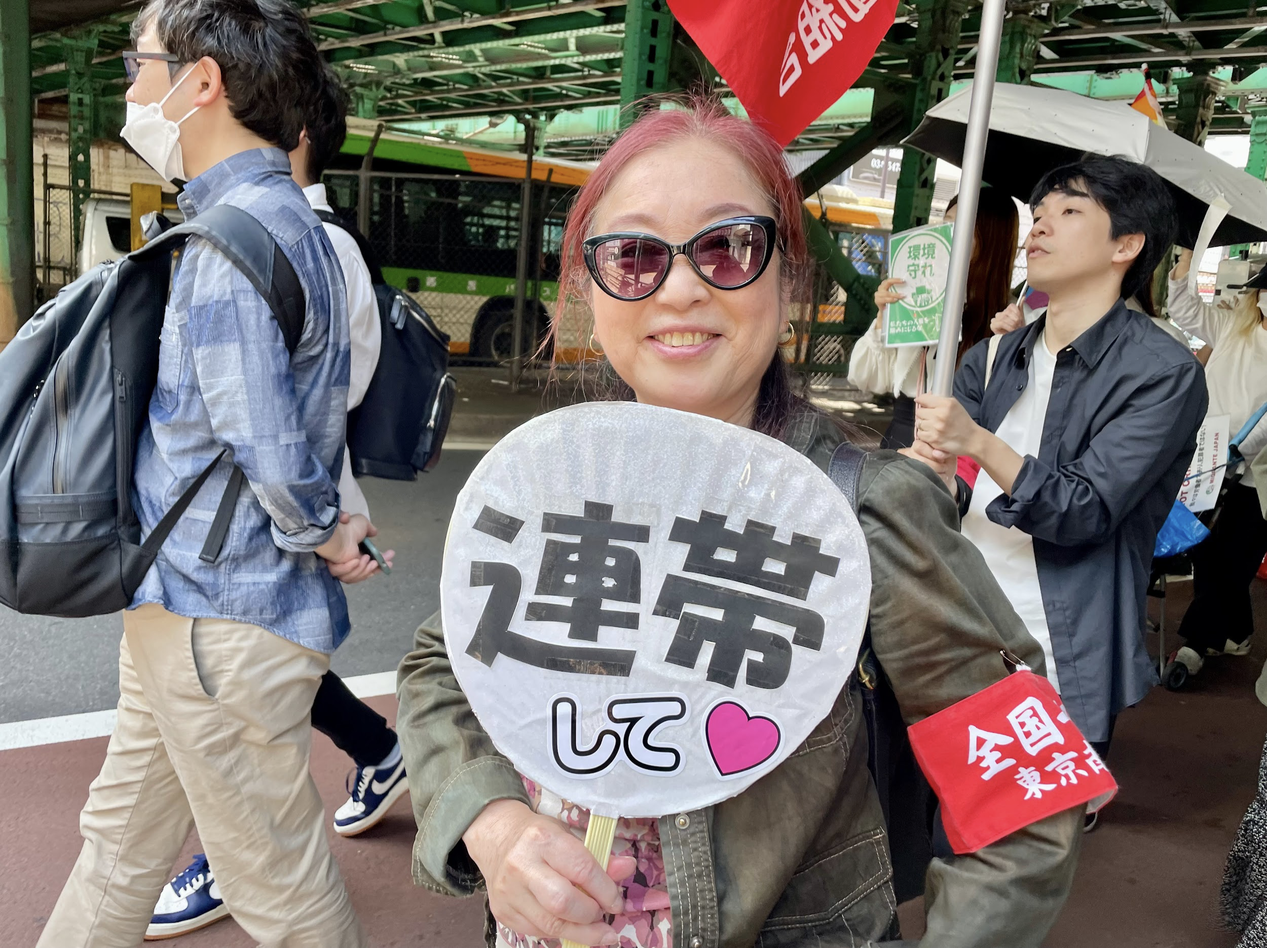 连合是日本最大的全国总工会,其中央May Day通常在五一节前的周末于东京代代木公园举办。今年4月26日(周六),有29,200人参加了连合May Day,主题为“将对和平的愿望传递给下一代!让我们共同打造互相支持的安心社会与确实的未来!”。“互相支持”是日本政府新自由主义化的修辞,把社会保障变成个人的责任。