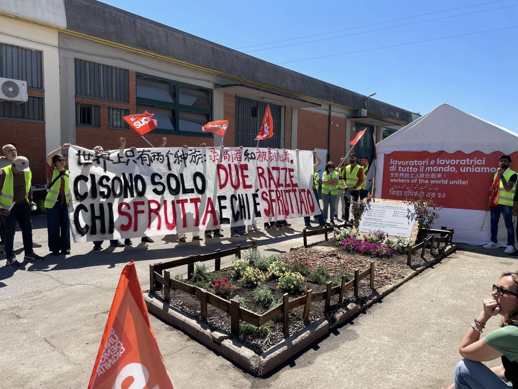 在在靠近佛罗伦萨的纺织之城普拉托,草根工会 Sudd Cobas 发起了由两个部分组成的“五一”特别行动。中午,工会在普拉托Macrolotto 1工业区揭幕了一座自发建立的纪念碑,悼念2013年12月在工厂中去世的七名中国籍工人。