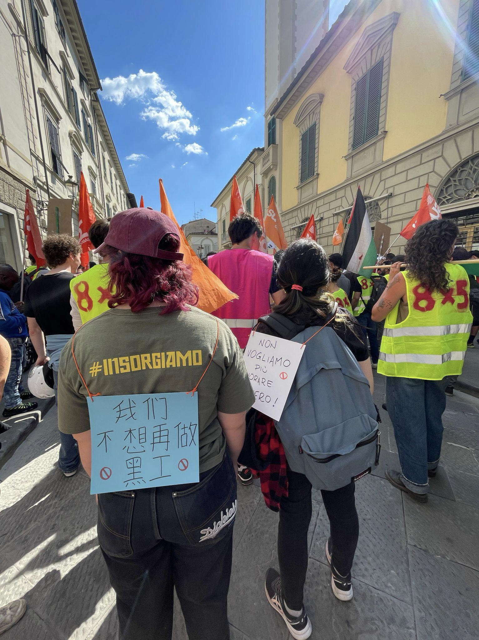 这座纪念碑也是 Sudd Cobas 自上月起“8x5之春”运动的一部分,该运动旨在通过罢工与集体行动,推动工厂落实法定工时(每日8小时、每周5天)和基本劳动保障。在普拉托的工业区,成千上万的跨国工人每天工作十二小时甚至更多,缺少基本劳工权利。