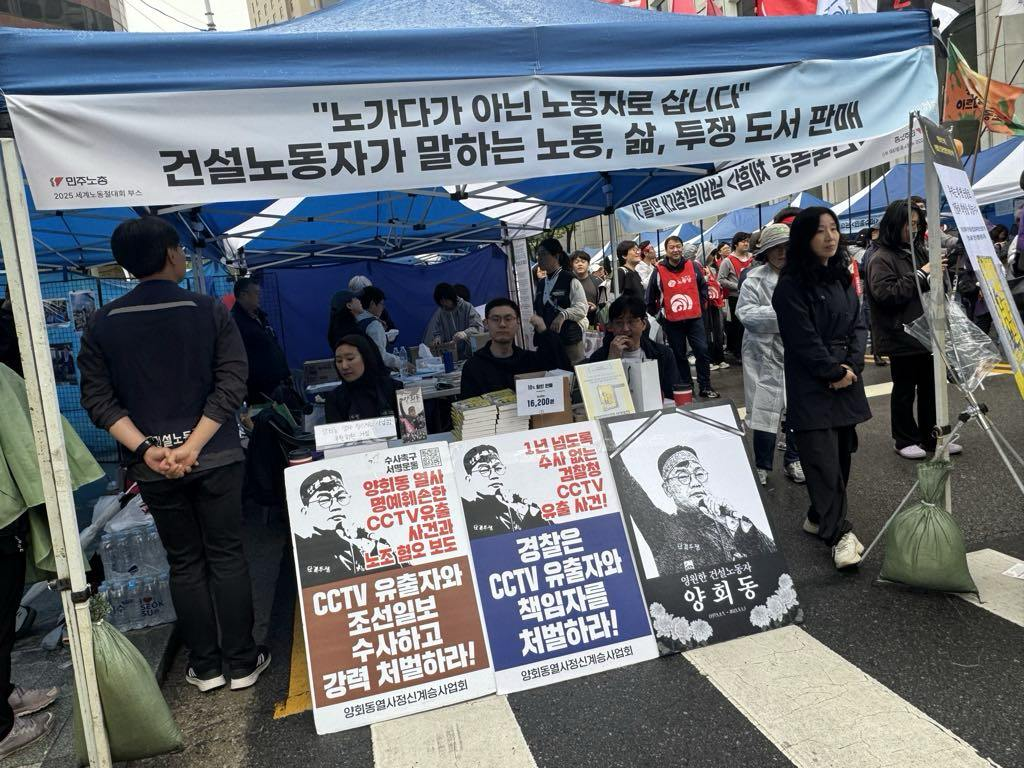 左方第一个摊位下方摆着三张看板,都有同一位一手拿着麦克风、一手高举的男人的黑白照片,看得出是一位工会领袖;其中一张上面中央往两边挂了两条黑丝带,看得出他已经去世。海报上写着「永恒的建筑工人梁海东」。刚刚用英文发音查了一下,才知道这位工会领袖因为被政府起诉,用以打压工会,因此自焚抗议而亡。