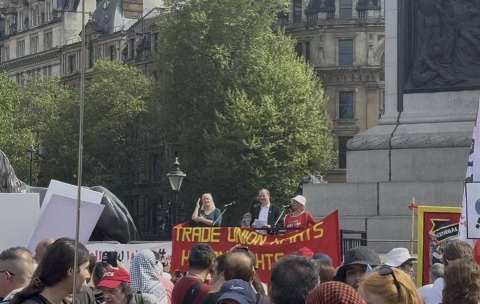 两点半左右,游行队伍抵达特拉法加广场,随后举行简短集会。包括铁路工会(RMT)副秘书长 Eddie Dempsey、教师工会 NASUWT 的 Jane Peckham、巴勒斯坦驻英大使 Husam Zomlot、Unite 工会伦敦东区代表 Tabusam Ahmed,以及残障者平权组织 Disabled People Against Cuts 的成员 Paula Peters。尽管演讲内容主题广泛、情绪强烈,但缺乏聚焦明确的政策主张与行动号召,也未提出针对当前立法或选举周期的具体策略。随着演讲推进,广场上大部分游行者陆续离场,集会现场逐渐趋于松散。