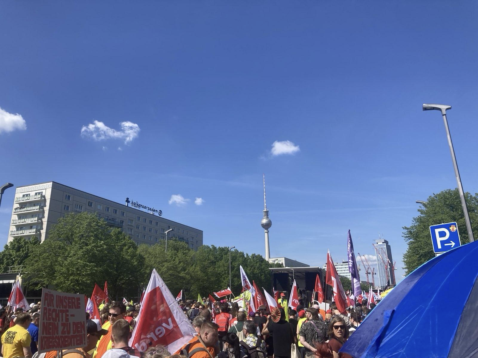 五一是柏林的公共假期,从早到晚都有抗议活动平行发生。最主要的两场是上午1万多人的工会游行和下午3万人的“革命五一”草根团体游行。