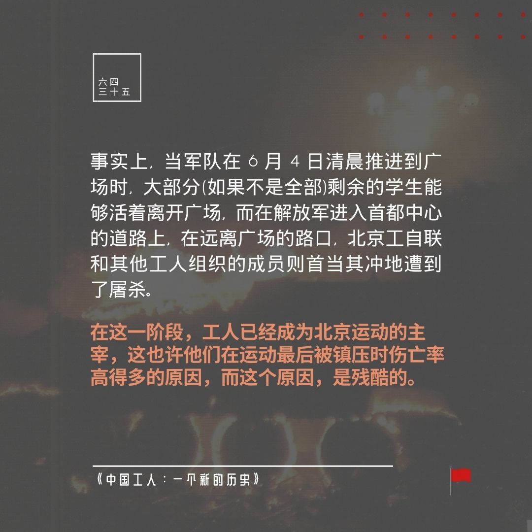 严厉打压参与运动的工人,成为了1990年代市场改革加速的条件,最显著的是1990年代初的食品市场自由化,因为工人本来一定会抵抗的。随着1989年之后中国经济愈发融入全球资本主义,学生和工人之间的经济利益也进一步分化了。…