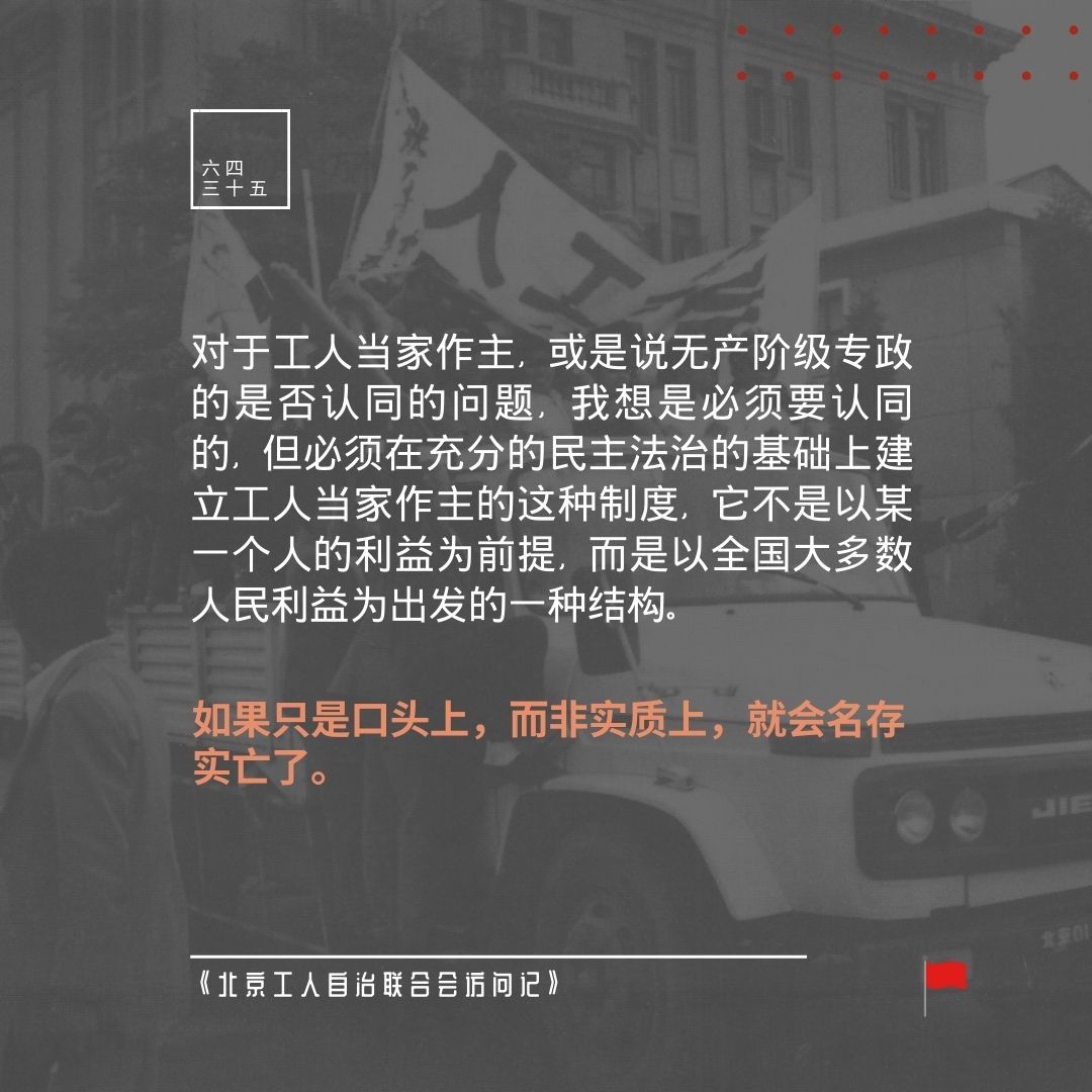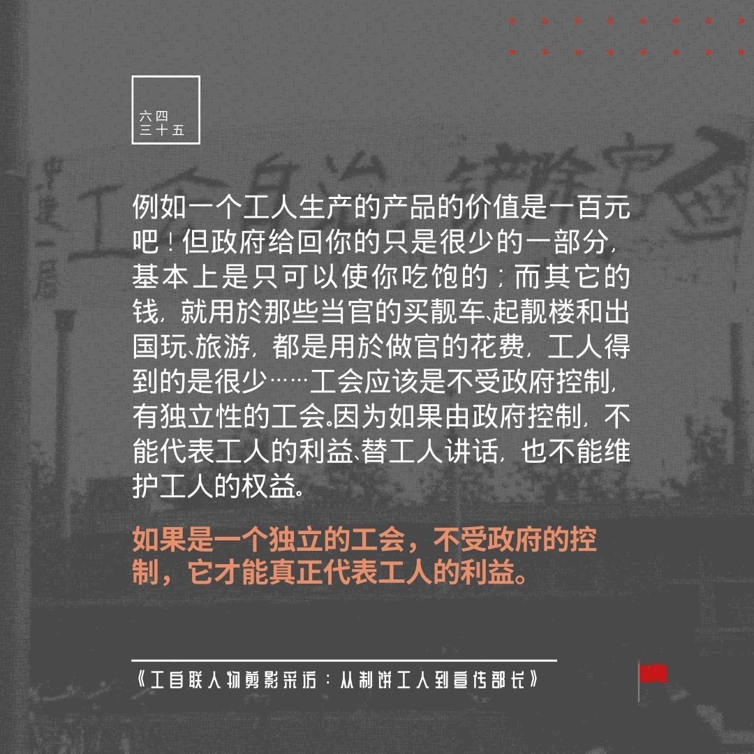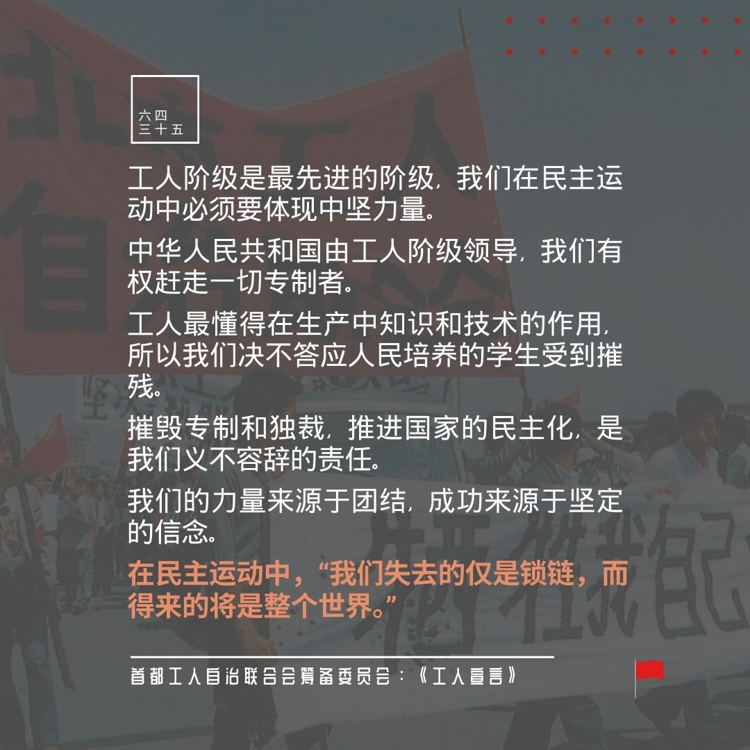 本次工劳特辑,通过呈现“八九”期间工人参与者的自述,希望让读者看到工人在天安门运动中至关重要的角色以及被其曲解的核心诉求——由于亲身经历了工作场所内官僚制度的危害,反抗官僚独裁、建立独立工会一直是广场工人的核心诉求,这也是工人们对民主最朴素、最真切的理解。