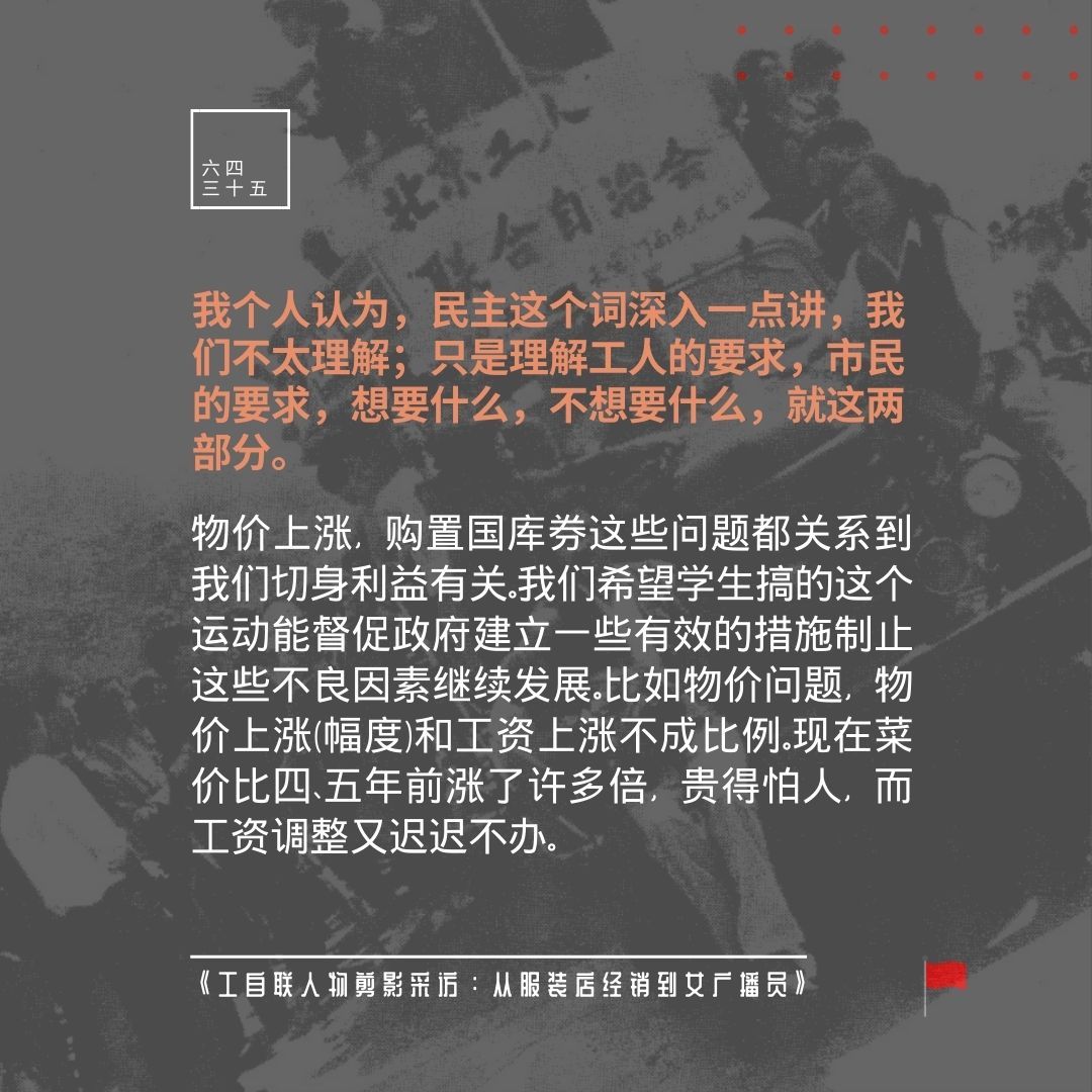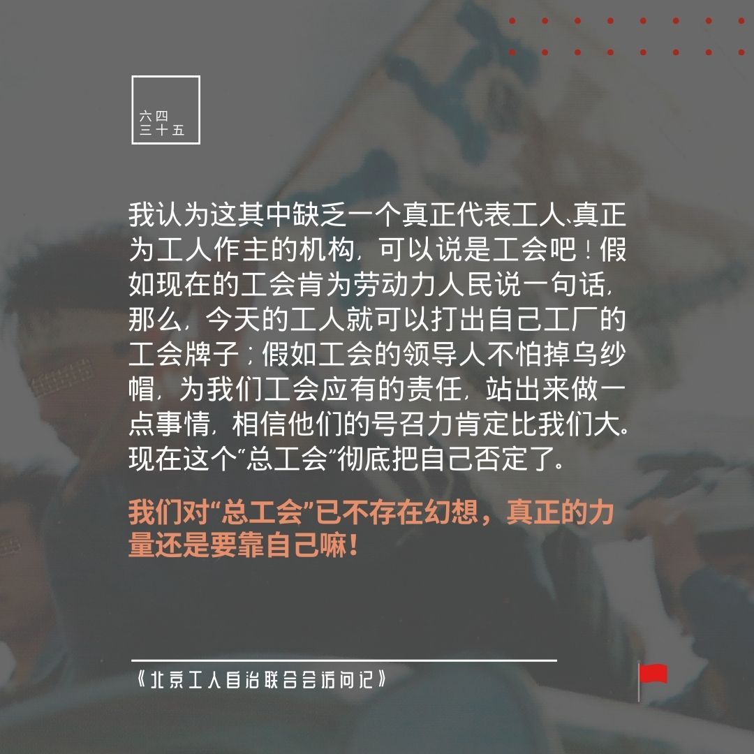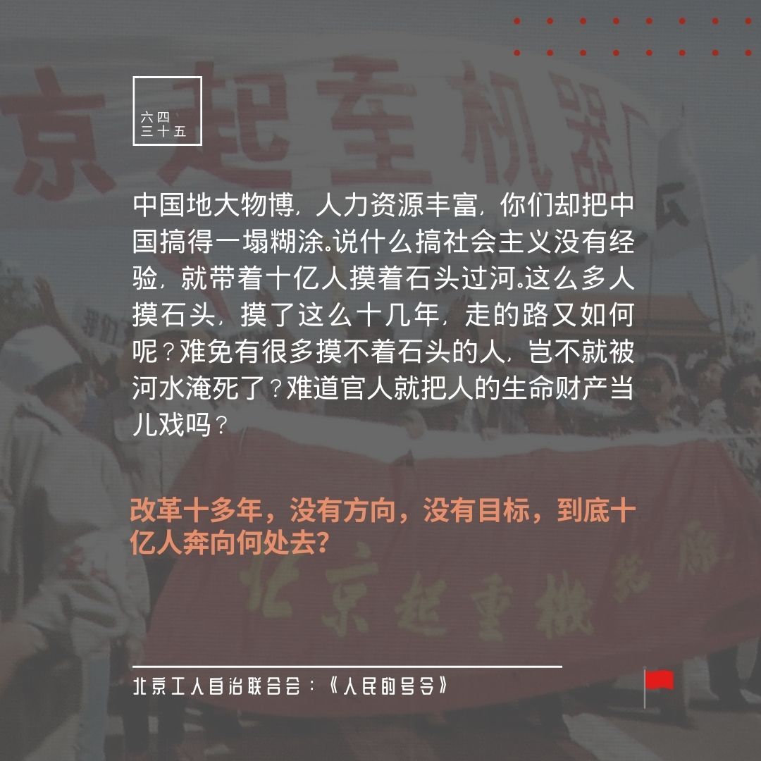本次工劳特辑,通过呈现“八九”期间工人参与者的自述,希望让读者看到工人在天安门运动中至关重要的角色以及被其曲解的核心诉求——由于亲身经历了工作场所内官僚制度的危害,反抗官僚独裁、建立独立工会一直是广场工人的核心诉求,这也是工人们对民主最朴素、最真切的理解。