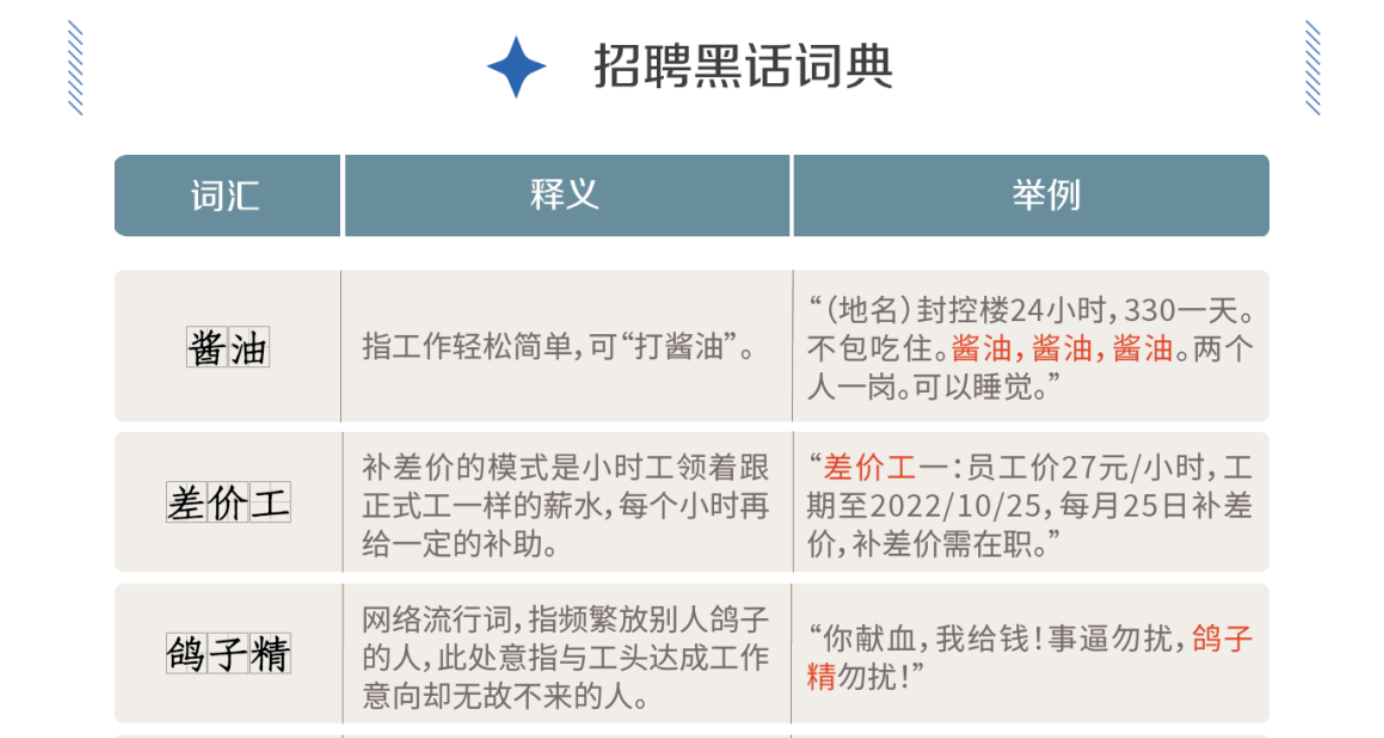 很有趣也很详尽的一篇调查报道,作者收集了3个“日结用工群”中工人们的交流对话、招聘广告,分析这群被称为酱油工的日结工人的工作偏好与劳动智慧。分析内容包括行业、工作内容、时长、招聘要求、劳务中介的欺骗等,推荐大家阅读。