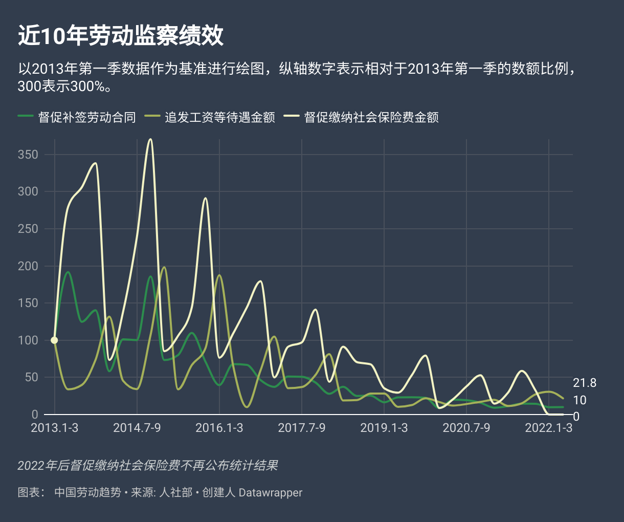 10月底,网站"中国劳动趋势"整理人社部统计数据后发现国内劳动监察部门自2017年之后快速懒政化,处理劳动争议案件和对于企业主动监察次数均明显减少。并且,劳动监察部门在追回工资数额、要求企业补签劳动合同数量、督促补缴社保金额等方面也呈现严重的绩效下滑。阅读原文