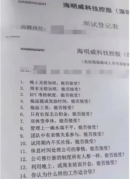 10月初,一张深圳海明威科技控股(深圳)有限公司面试表在网上流传。其中的大部分问题都明显违反劳动法,包括是否接受无偿加班、拖延工资、双休变单休、休息时间处理公事、晚上或周末培训开会、试用期不买社保等。而该公司在回应时轻描淡写,说“没有一个标准答案,只是一个(调查),对面试结果没有影响。”工作日加班、双休变单休的问题已经讨论了多年仍没有得到解决,反而公司们得寸进尺,越来越把加班当成常态。 阅读原文