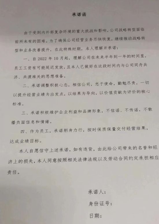 10月28日国美总部的全员大会上,国美电器董事长黄秀虹表示,公司到12月底之前只会给员工上社保,不会再发工资了。今后中长期,工资发放也存在不确定性。并且,国美还要求员工签署承诺函,要求员工"相信"一个已经发不出工资的公司。