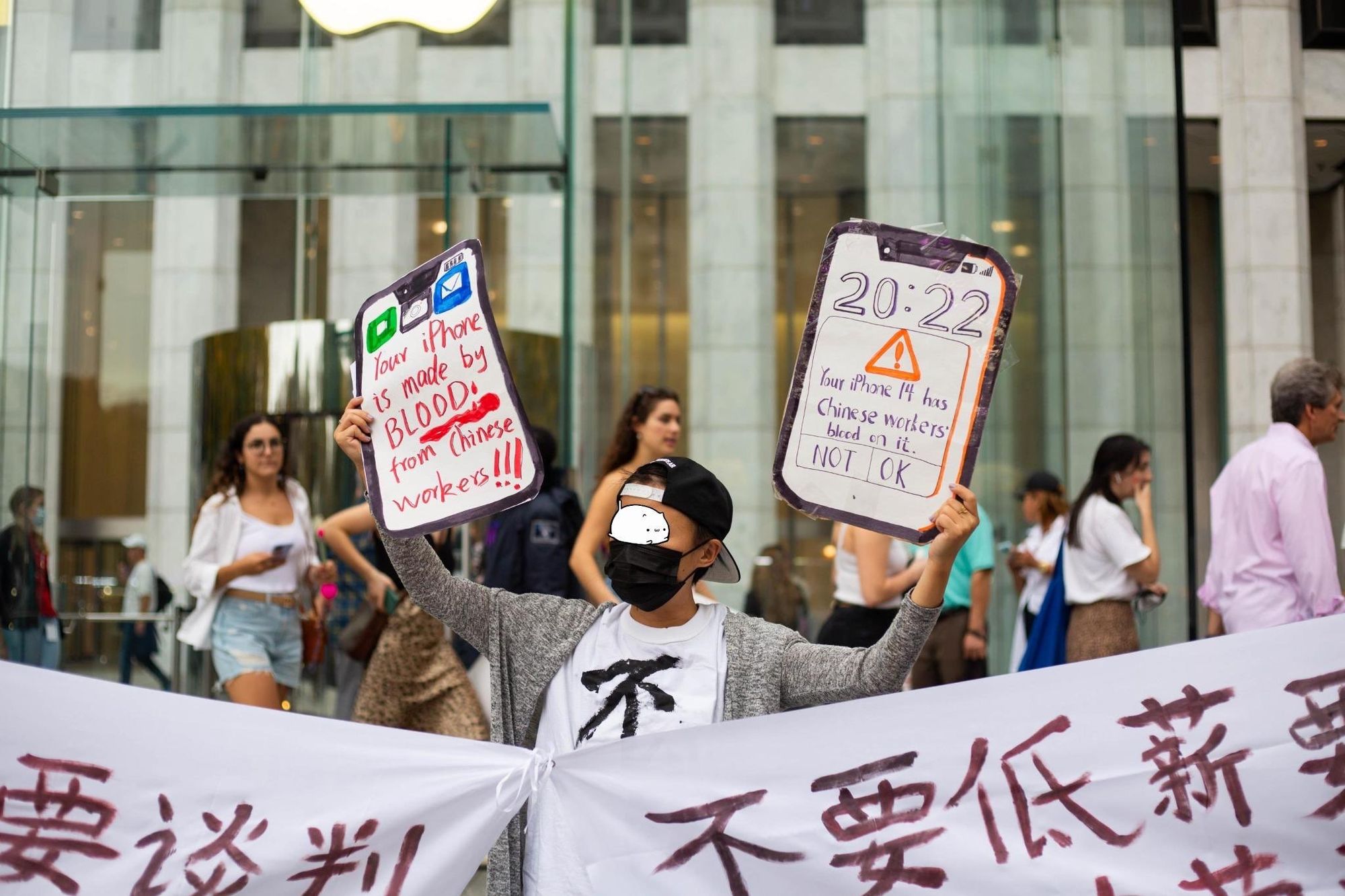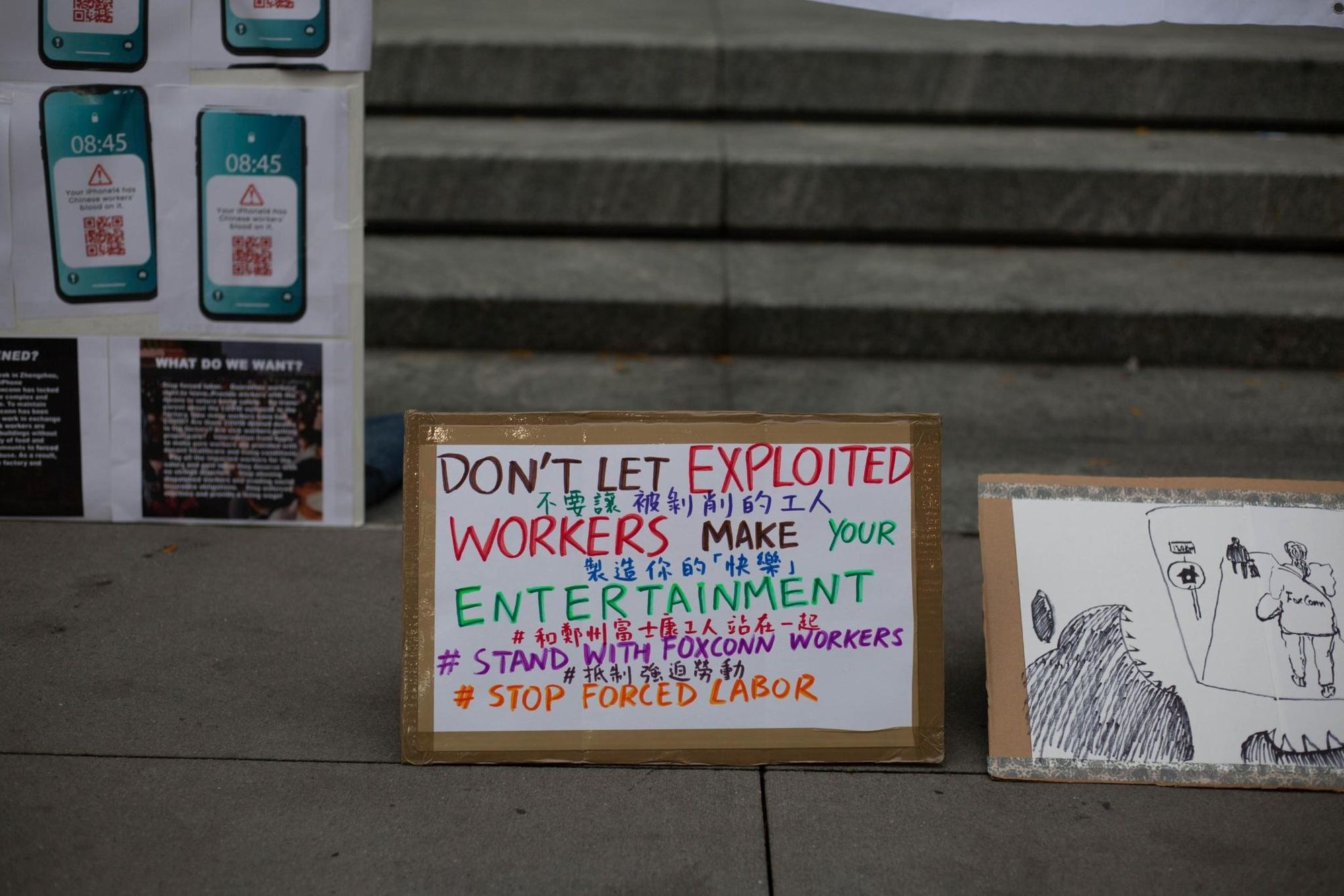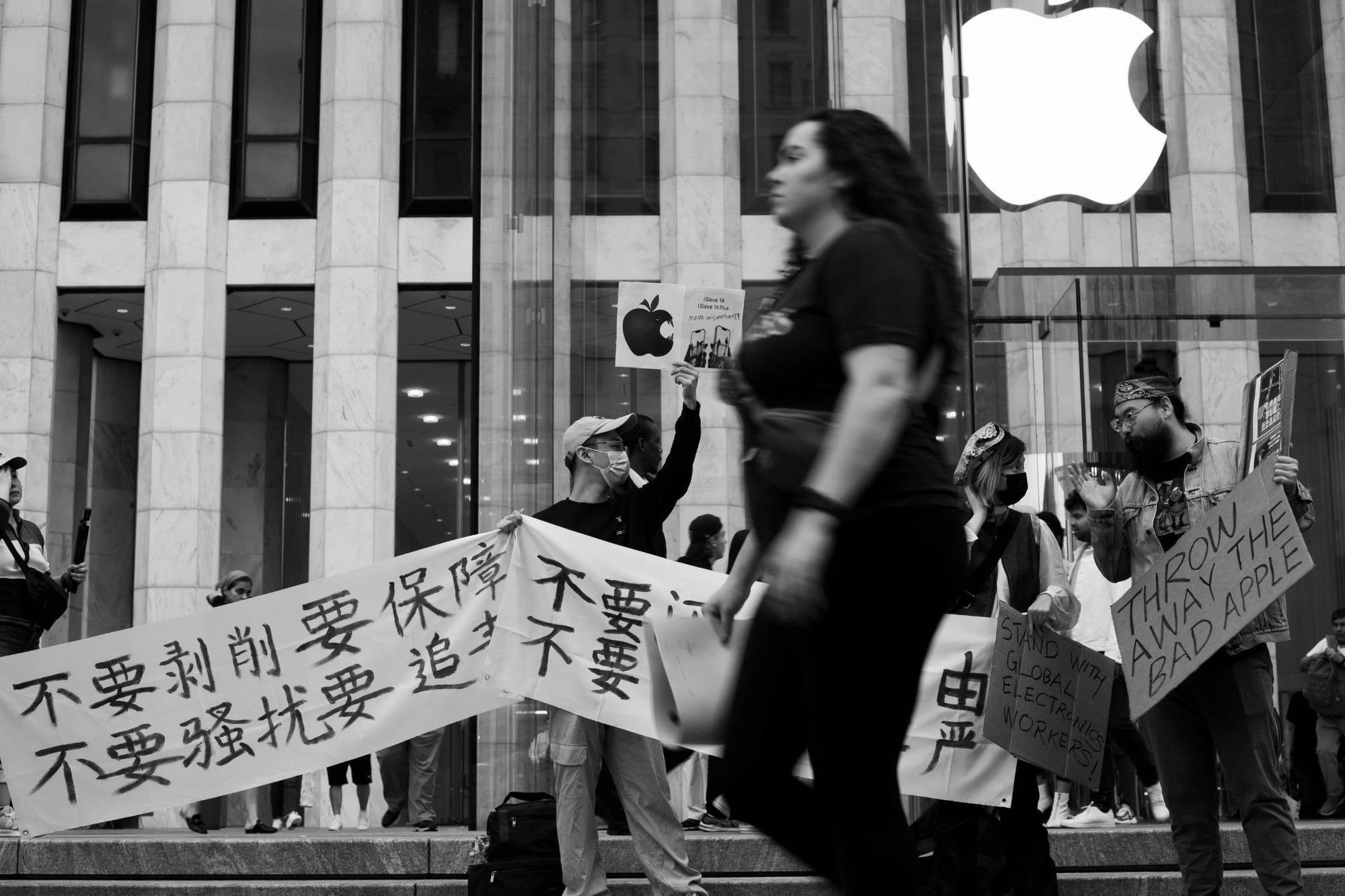 11月6日下午,在美国纽约的苹果旗舰店门口,一群中国留学生以中英文抗议苹果公司对于富士康工人健康权、劳动权益的漠视,抗议疫情下对工人增加的工厂控制甚至强迫劳动。有人以"iSlave"讽刺苹果公司的产品背后是强迫工人进行血汗劳动。