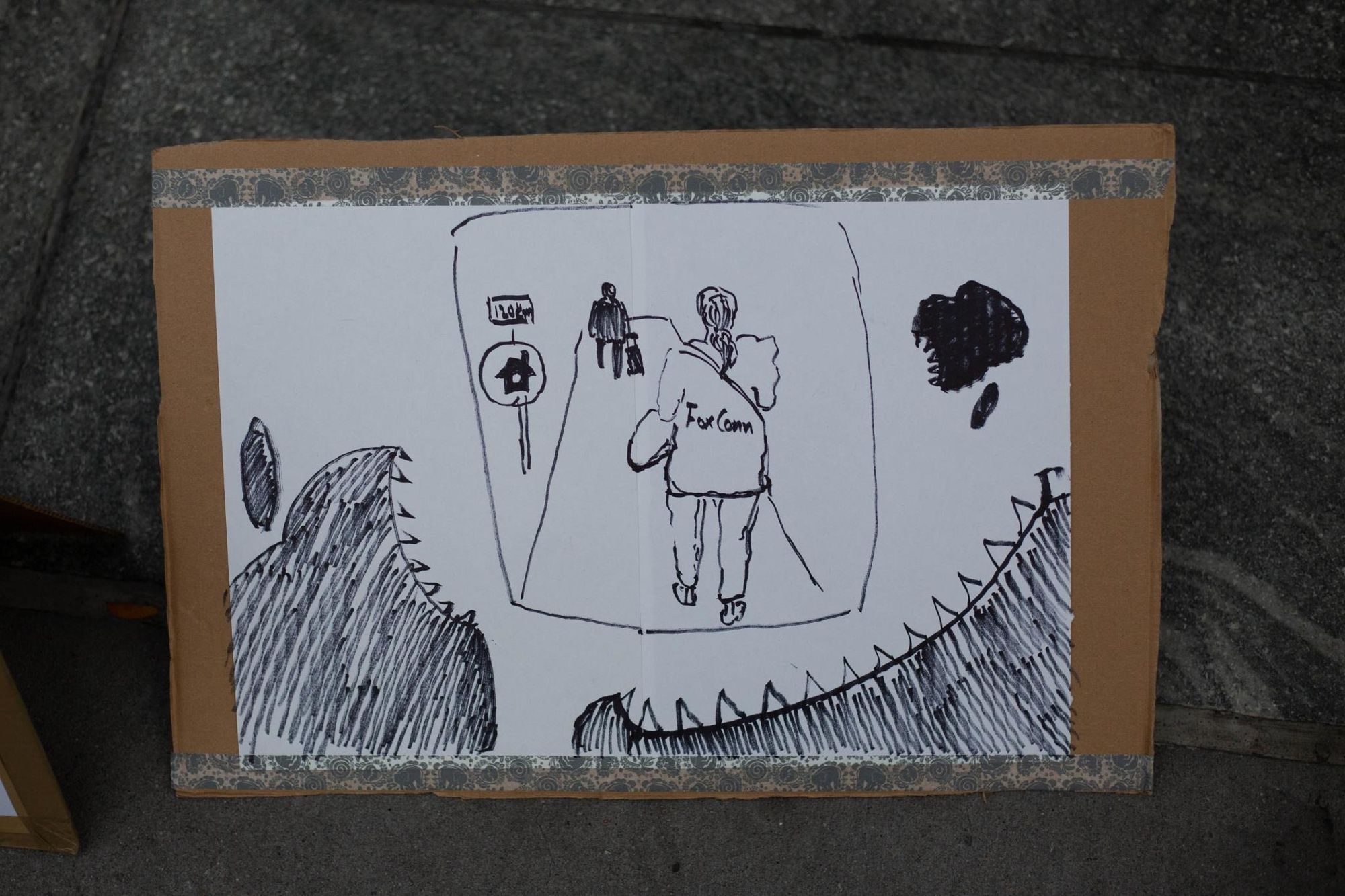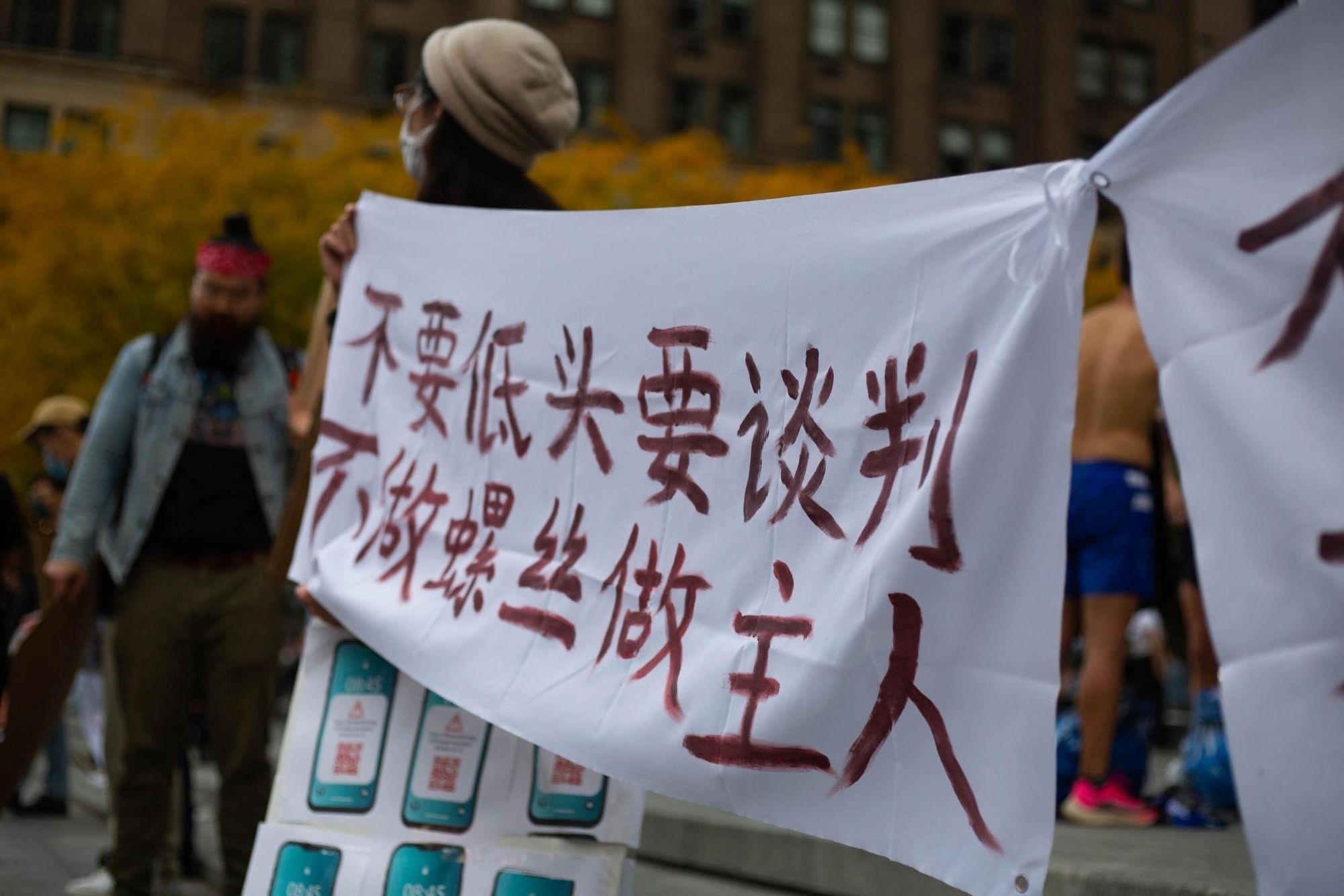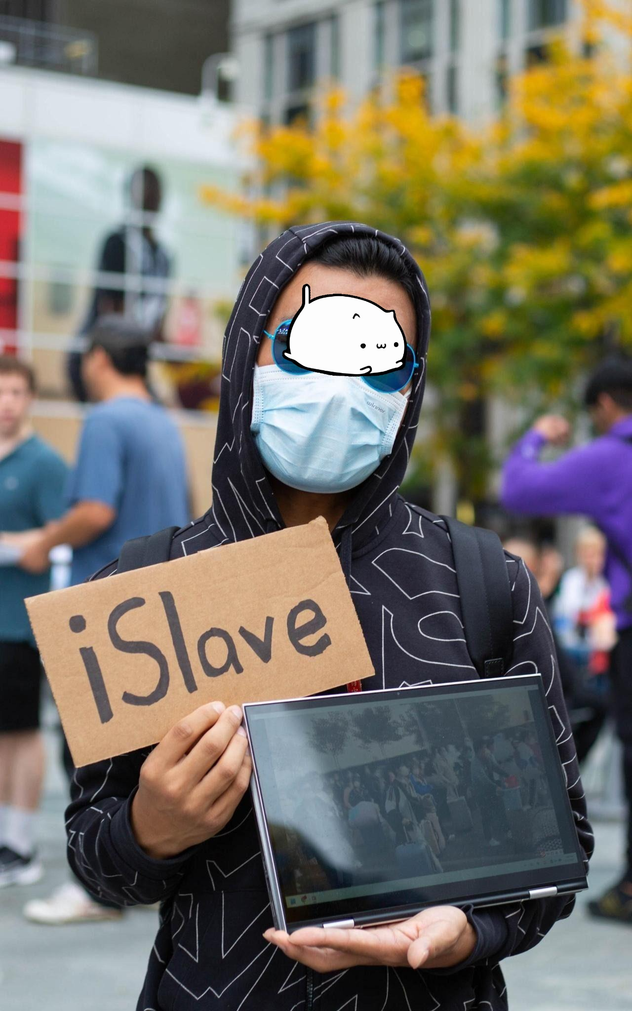 11月6日下午,在美国纽约的苹果旗舰店门口,一群中国留学生以中英文抗议苹果公司对于富士康工人健康权、劳动权益的漠视,抗议疫情下对工人增加的工厂控制甚至强迫劳动。有人以"iSlave"讽刺苹果公司的产品背后是强迫工人进行血汗劳动。
