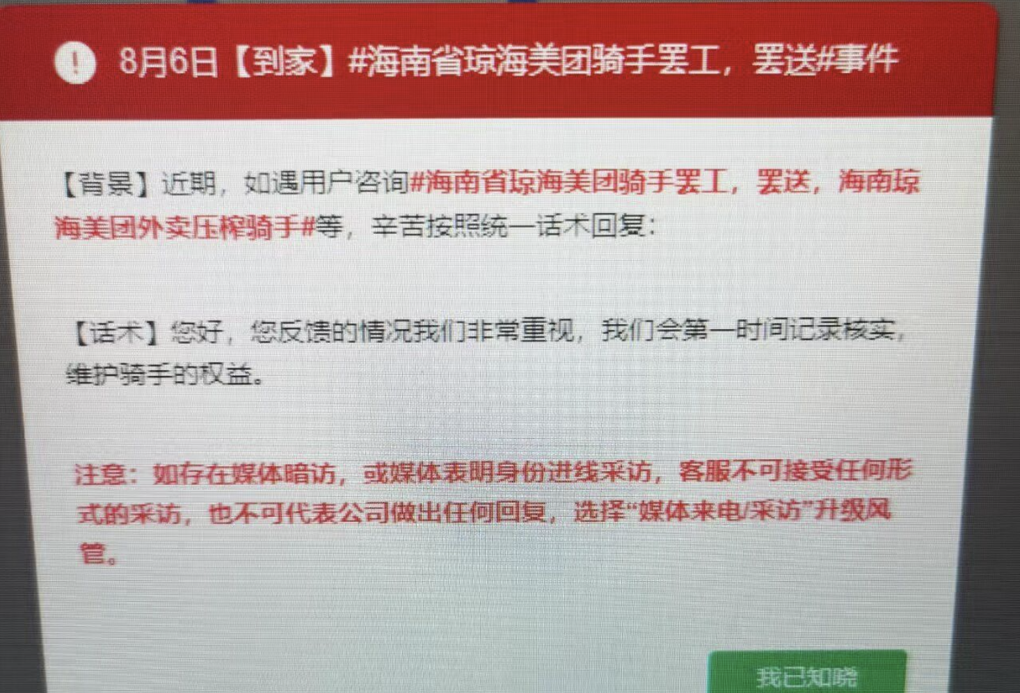 8月6日,有网友投稿称美团客服后台接到公司要求,遇用户咨询或者媒体采访关于海南琼海美团骑手罢工罢送事件,需用公司统一话术回应。今年4月汕尾美团外卖员也爆发过罢工,抗议美团对本地骑手压价罚款,最终以美团恢复本地骑手待遇告一段落。但美团面对罢工依然主要采取强势态度。关于本次海南罢工的相关视频也都从各短视频平台被下架。相关文章,阅读原文