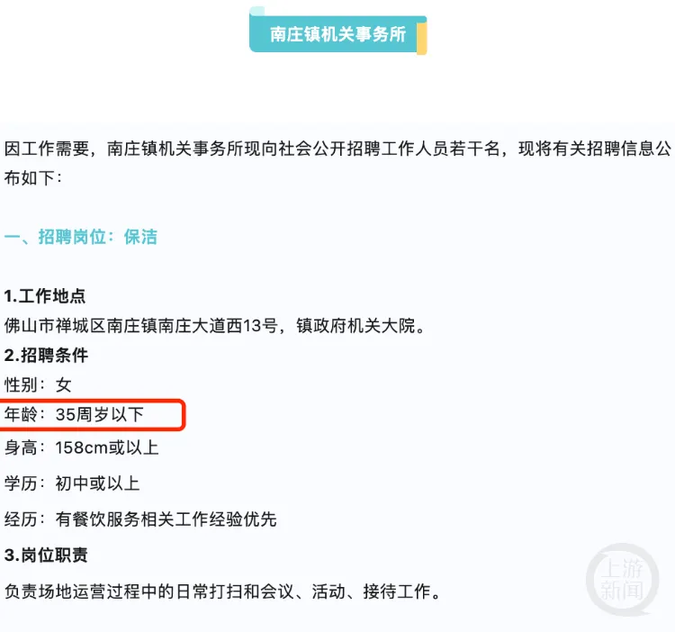 广东佛山一机关大院招聘女保洁员,要求35岁以下引发质疑