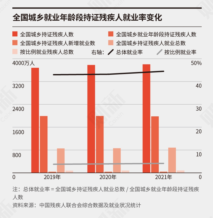 就业市场低迷的当下,残疾人找工作变得更加困难。今年9月,残障人士王斌接到了运营岗位的面试邀请,但向对方告知自己的残障情况后,对方直接取消了面试。中国残疾人联合会数据显示,2019年至2021年,全国城乡就业年龄段的近2000万持证残疾人中,实际就业率不足45%。虽然相关促就业政策不断优化,但残疾人真实就业规模和收入实际上是下降的,不少企业以“挂靠”方式减免残保金,甚至形成了一条灰色产业链。学者杨立雄建议对企业按1%、对国家机关和事业单位按2%要求聘用残疾人,以改善残疾人的就业状况。阅读原文