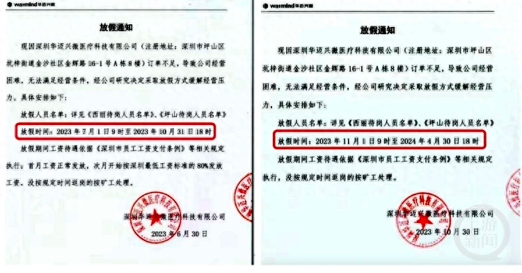 11月底,深圳华迈兴微医疗科技有限公司长达10个月的放假通知引发关注。该公司是一家医疗健康诊断企业,流传的《放假通知》中称因公司订单不足,为缓解经营压力,给部分员工分两批时间段放假,共放假10个月,第一批放假中没有自行离职的员工和第二批继续一起放假。放假期间首月工资正常发放,其余时间按照深圳基本工资的80%发放。工作人员表示此举实际上是希望被放假的员工“不要回来了”,但公司没有钱赔偿,因此采用“合规”的方式逼迫人离职。阅读原文