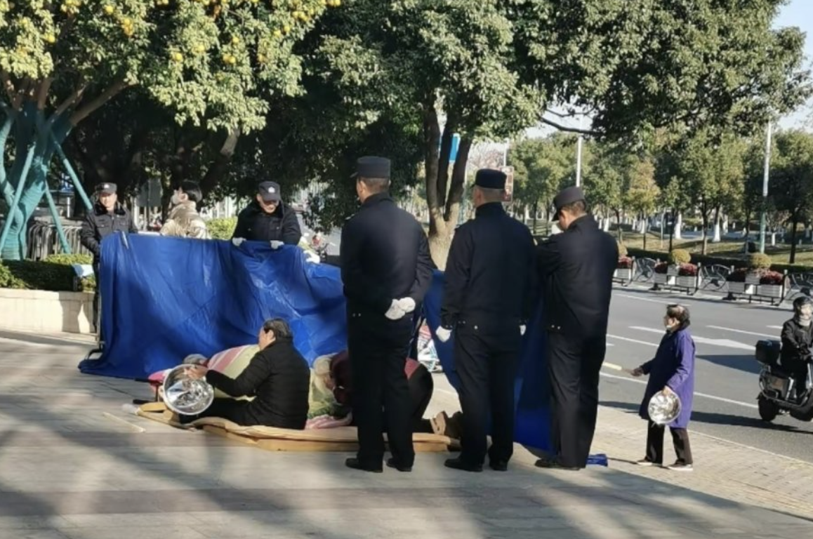 12月1日,在上海宝龙集团讨薪的农民工们露宿了一个月,几名保安用蓝布将工人们围住,为工人“遮风挡雨”。(来源)