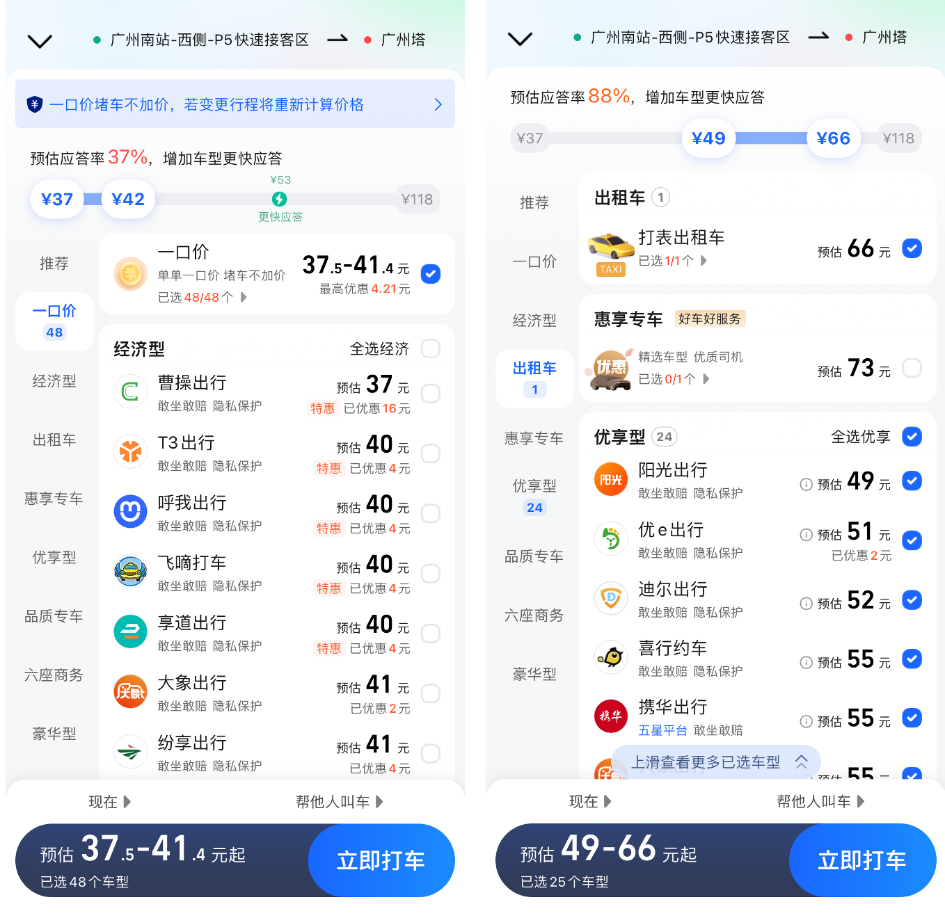 以广州南站到广州塔这段行程为例,出租车费为66元,快车要50元以上,而“一口价”的车费不到40元。“一口价”因价格低廉受到大多数乘客的青睐,不少人养成了只打“一口价”的习惯,并且在高德地图的打车选项里,“一口价”是默认勾选的。
