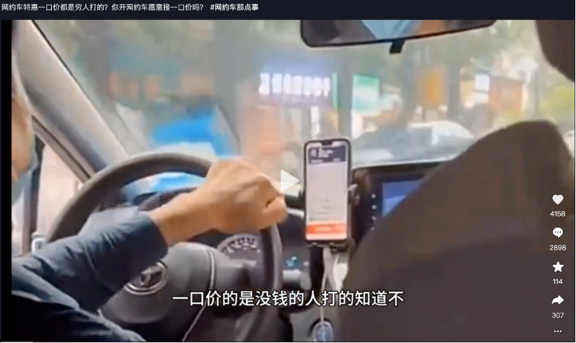 在上述左图中,我们可以看到打车界面特意强调了“一口价堵车不加价”,像广州这样交通拥堵严重的城市,上下班高峰期在市区内寸步难行,如此高的时间成本也不应该由司机独自承担。大多数司机对“一口价”嗤之以鼻。在抖音平台上,我们也能看到很多网约车司机的吐槽。有司机因接到“一口价”订单不满,直接呛顾客说“一口价是穷人打的”。