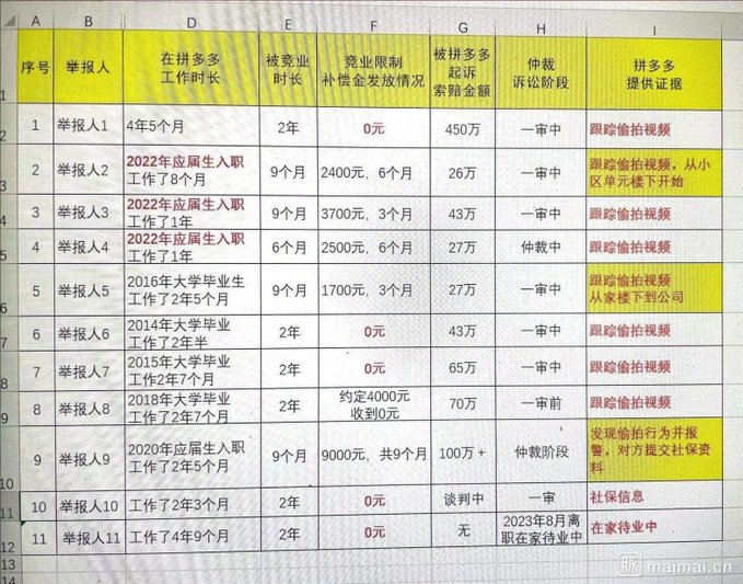 在微博发声的草娃今年24岁,在2022年加入拼多多工作8个月后,因健康受损而选择离职。离职时,她被公司强制执行了为期9个月的竞业禁止条款,并接收了每月2400元的补偿金。然而,在收到6个月补偿后,她收到拼多多发起的劳动仲裁申请书,要求支付28万元的赔偿金。(来源)更恶劣的是,多位有相似经历的前员工陆续发现,在案件被审判的过程中,拼多多通过跟踪、偷拍的方式为其诉讼过程取证,导致他们难以对案件判决上诉。