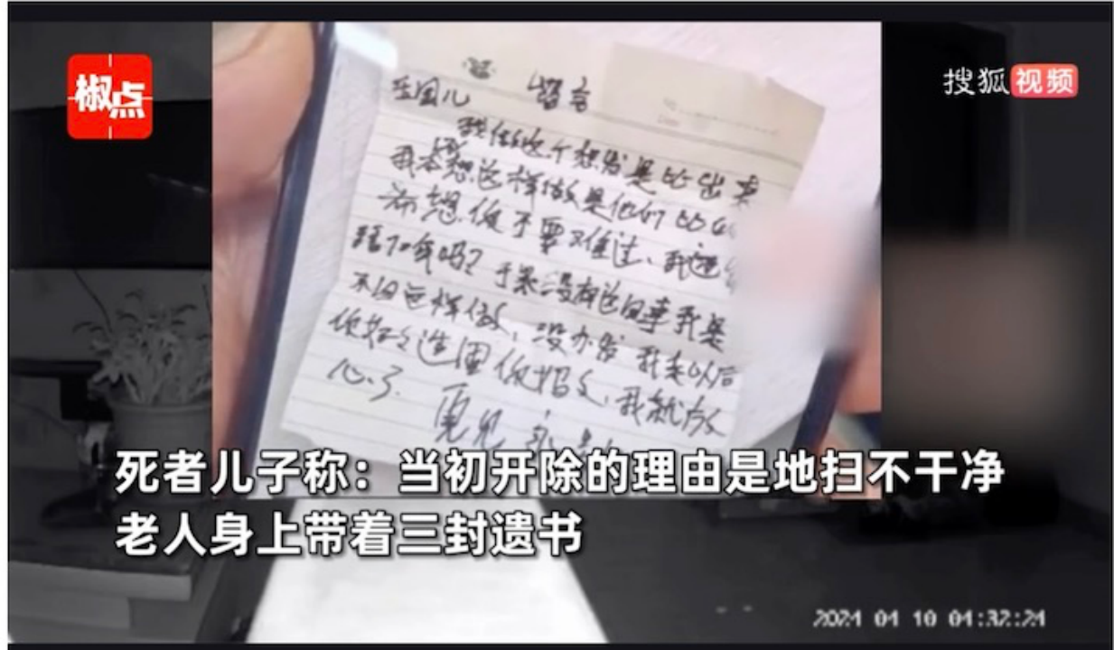 4月初,大连市一名71岁保洁员被馨顺达物业开除,一周后的4月10日在物业办公室上吊自杀。死者儿子称父亲被开除的理由是地扫不干净。保洁员离世时身上带着三封遗书,其中一封留言写道:我的这个做法全是你们逼出来的,经理、班长你们不是人。事发后物业愿赔1万,而家属只想讨回公道。15日馨顺达物业经理表示,活干得不好才将其辞退,一周后上吊不可能有太多赔偿。阅读原文