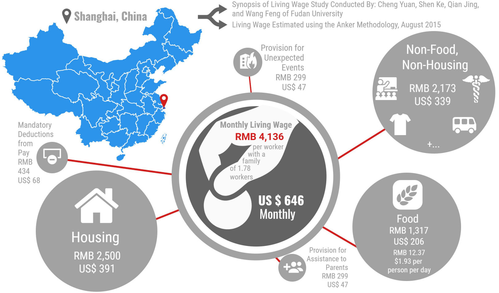 目前,全国各省市都有自己的最低工资标准,大多落在2000元左右的范围。其中,最高的是上海市,达到2690元。最近几年,我们也经常听说最低工资调涨的声音,但其实这些调涨远远追不上当地快速增加的生活成本。以上海为例,2015年国际组织The Global Living Wage Coalition计算出要在上海过正常合理的生活(来源),每个工人最低每月需要到手4136元人民币,才可以支付其家庭开支(每个家庭平均1.78工人)。其中家庭开支包括食物费用1317元、租房2500元、交通衣物等其他费用2173元、其它还有储备金、工资扣除额、给父母的赡养费等共1032元。