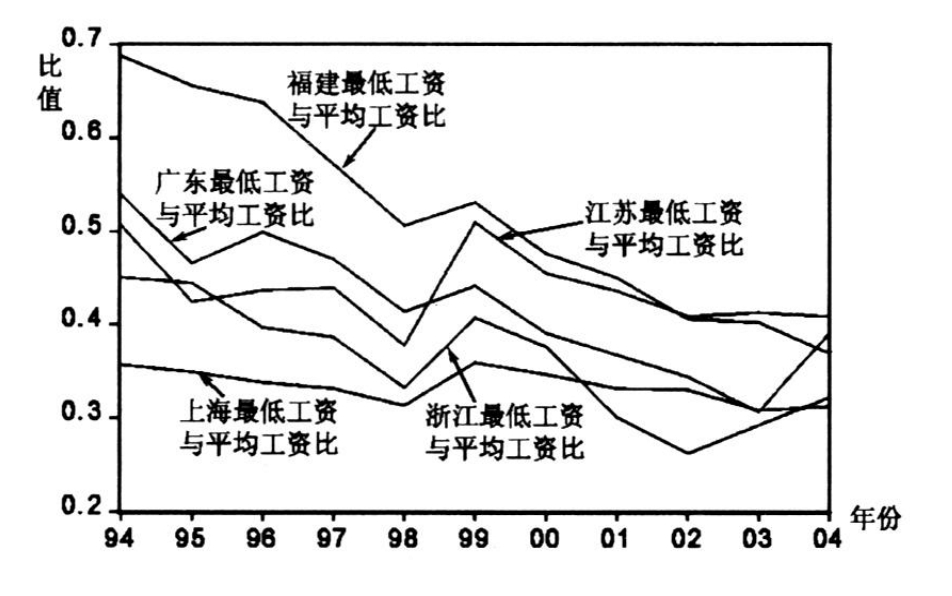 如果横向对比国际,国内现行的最低工资标准也存在严重问题。在人社部的《最低工资规定》中明确写到“国际上一般月最低工资标准相当于月平均工资的40—60%”(来源),然而国内的最低工资标准却普遍连40%都不到。例如上海市2023年社会平均工资达到12307元每月,然而最低工资却仅仅相当于平均工资的21.8%。四川每月社会平均工资约7518元,而第一档最低工资也仅有2100元,仅相当于28%。这样的标准无论放在发达国家或发展中国家,都是非常不可思议的。极低的标准相当于让工人自己面对企业谈价格,在缺乏工人组织的前提下,这样的谈法只能谈出惨淡的现实。