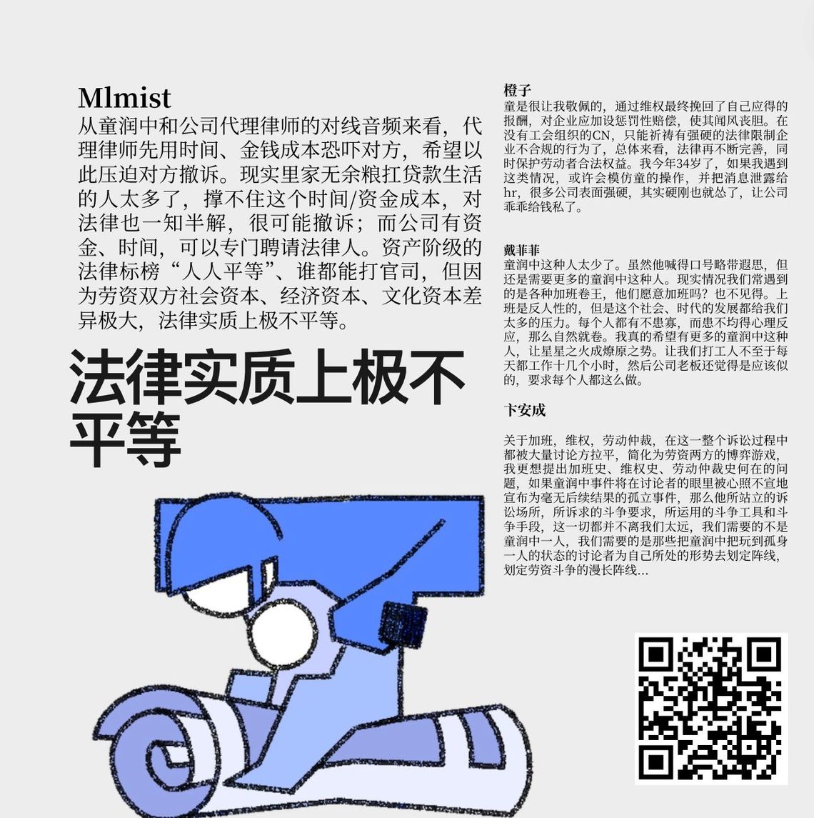 关于加班,维权,劳动仲裁,在这一整个诉讼过程中都被大量讨论方拉平,简化为劳资两方的博弈游戏,我更想提出加班史、维权史、劳动仲裁史何在的问题,如果童润中事件将在讨论者的眼里被心照不宣地宣布为毫无后续结果的孤立事件,那么他所站立的诉讼场所,所诉求的斗争要求,所运用的斗争工具和斗争手段,这一切都并不离我们太远,我们需要的不是童润中一人,我们需要的是那些把童润中把玩到孤身一人的状态的讨论者为自己所处的形势去划定阵线,划定劳资斗争的漫长阵线...