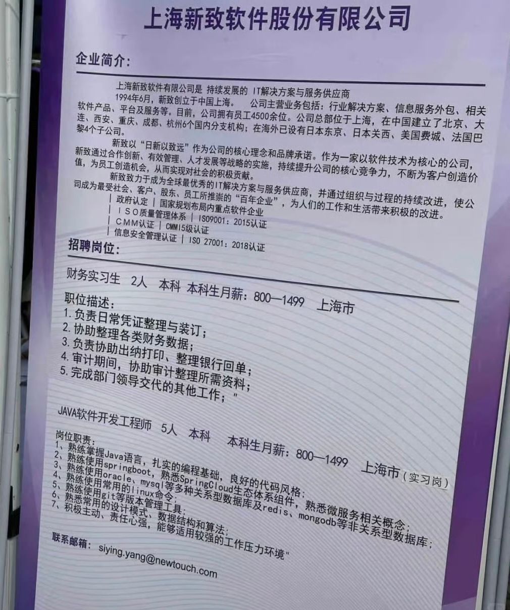 上海市2025届高校毕业生校园招聘会上,一家软件公司的招聘海报上写着:招聘java软件开发工程师,本科生月薪800-1499元。