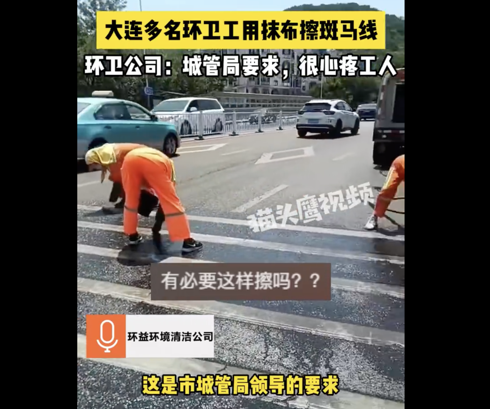 今年6月,大连有环卫工被要求用抹布擦斑马线。工人在快车道上工作,旁边就是汽车开过,看起来非常危险。根据询问,命令来自城管局。光天化日下折磨环卫工。
