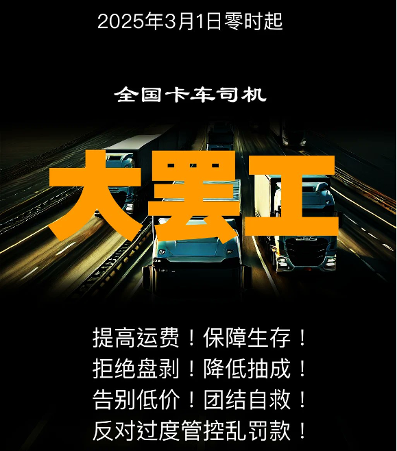 3月1日,中国各省部分卡车司机发起停运,抗议过低的运价和过高的平台抽成。早在2月下旬,卡车司机们就在社交平台上呼吁同行于3月1日零时起集体停运,以提高运费标准。1日凌晨起,大量司机在社交平台发布视频或留言表示已停运,部分司机称公路上大货车数量明显减少。但也有司机表示,仍有许多从业者未参与,平台接单依旧活跃,运输秩序未受明显影响。来源