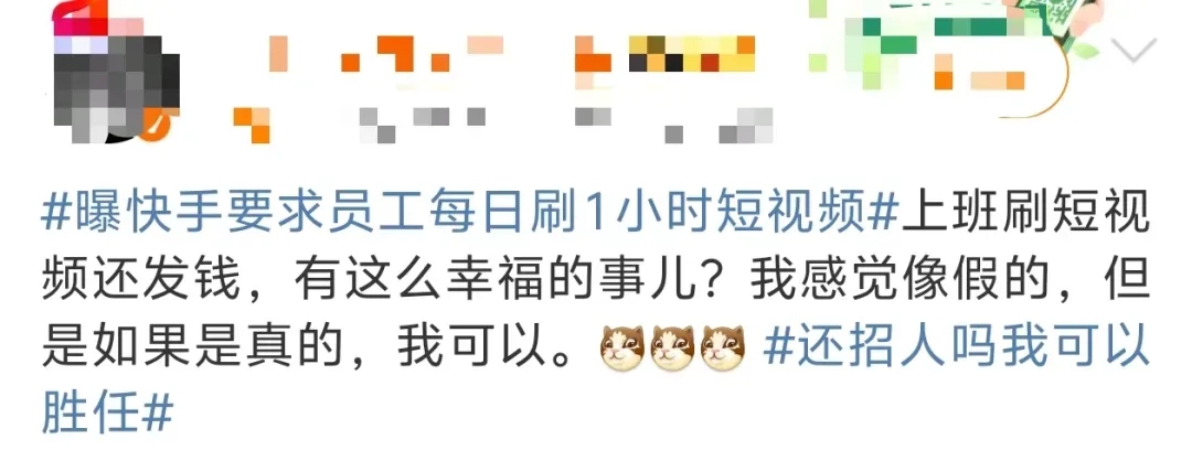 5月下旬,社交媒体有快手员工爆料称,快手要求多个部门的员工每日使用快手App刷满1小时短视频,并将使用记录抄送主管。据称,员工需通过企业微信每日上报使用时长,若连续多日未达标,可能影响绩效评级。技术岗员工可自愿完成任务兑换积分,非技术岗则需确保每日1小时。5月22日,快手表示上述爆料不属实,否认“强制”的说法。有网友将此戏称为“带薪刷视频”,然而,对劳动者的强制要求总是蕴含着各种潜在的损害与限制,即使看似娱乐性的内容,强制规定下也能成为挤压劳动者时间、施加额外压力的要素。来源1,来源2