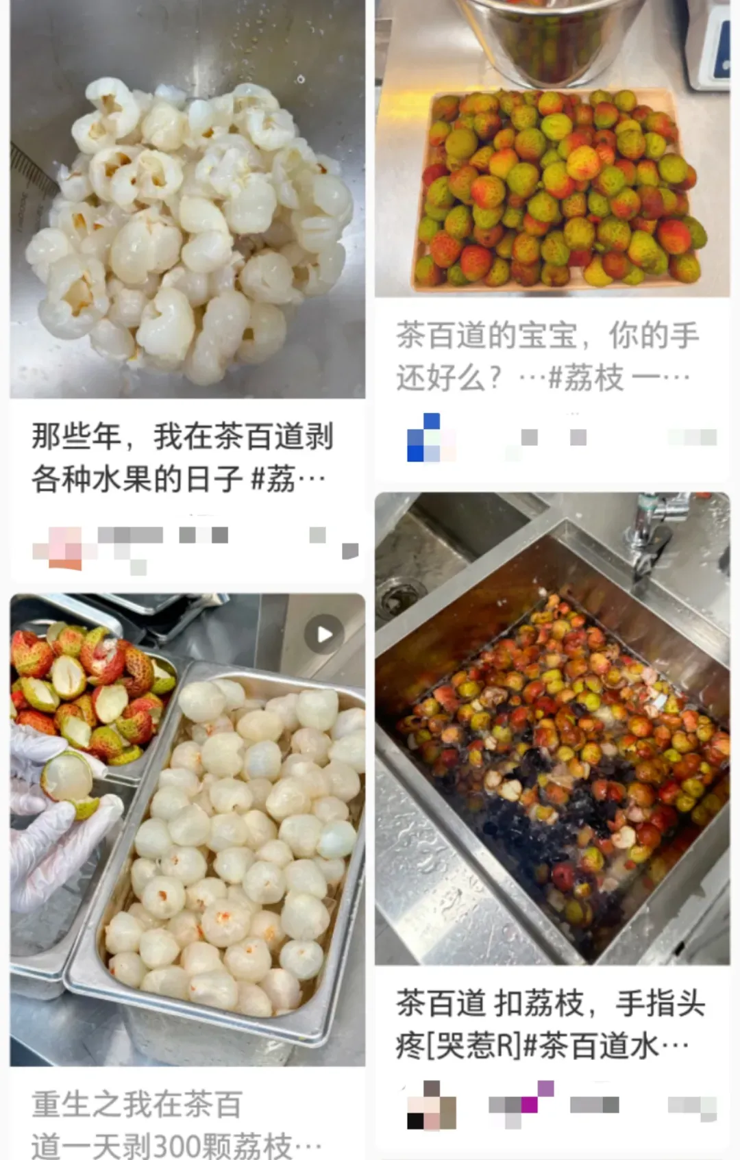 茶百道新推出的荔枝饮品颇受好评,却累哭了各门店的员工。用于新品制备的荔枝并没有经过集中的预处理,往往需要店员每日手剥数十斤。