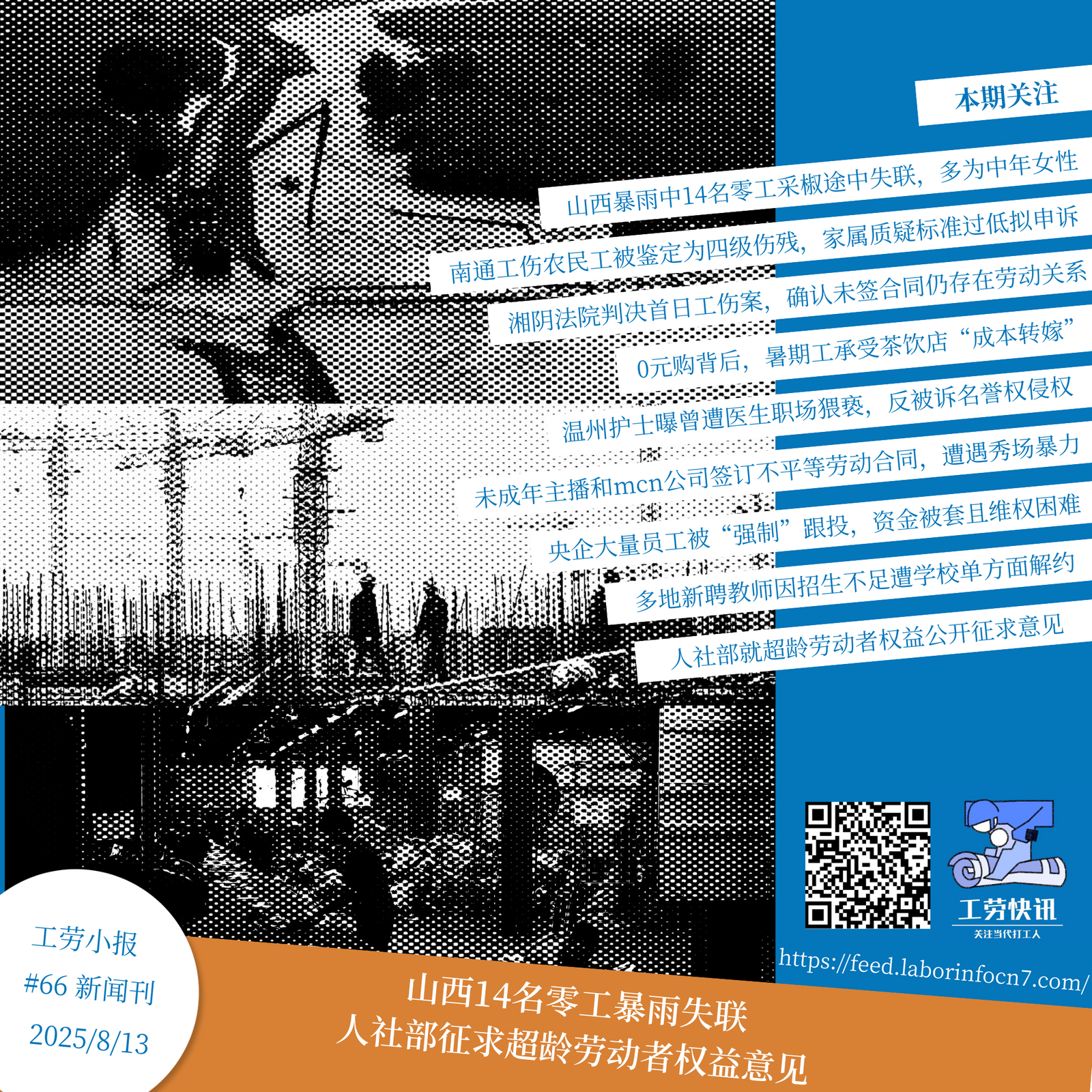 过去两周,山西14名零工在暴雨中失联遇难,其中多为中年女性,乡镇劳动市场的零散化,叠加频发的极端气候灾害,使村镇中老年女性劳动者面临更多生命威胁。与此同时,人社部就超龄劳动者权益公开征求意见。参与提出建议,虽一时难以推动结构改变,但仍属可为改善超龄劳动者处境所尽的微薄之力,此为一例意见参考。本期亦关注外卖大战下被剥夺的暑期工、遭学校单方面解约的新聘教师等群体。
