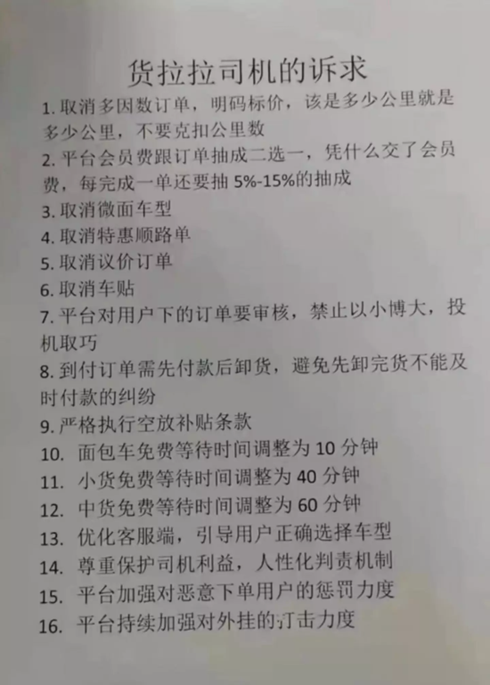 其中,深圳和东莞等地司机的罢工响应最为踊跃,大量司机开着货拉拉车包围各地总部,提出多达16条针对平台不公规则的具体诉求要求公司给予回应。传闻,温州、佛山等地的平台经理口头答应了司机们的诉求。但后续据货拉拉司机所说,平台规则虽有小幅改善,但并没有根本上达成司机们的诉求。此外,司机抗议期间交通部门再度约谈了货拉拉等平台。这已是货拉拉2022年第五次因“损害货车司机合法权益”等问题被约谈。
