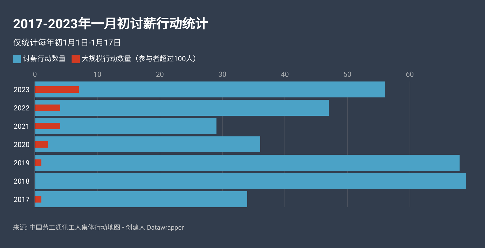 【工劳评论】年年欠薪年年讨,年年讨薪年年欠。上图为近几年一月初讨薪行动的统计,我们可以看到,2023年初讨薪行动不仅在总数上是疫情以来的高峰,同时大规模集体维权的比例也激增。今年截至目前已经有7起上百人参与的讨薪行动。