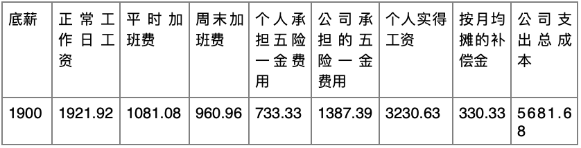 我们用最简单的模型来进行计算。以某厂正式工为例,工资构成为底薪、加班费。底薪为当地最低工资1900元/月,按照每天加班3小时,每周工作6天计算(最常见的加班情况),一个月30天。非全日制用工(小时工)法定最低每小时工资标准18.1元/小时。