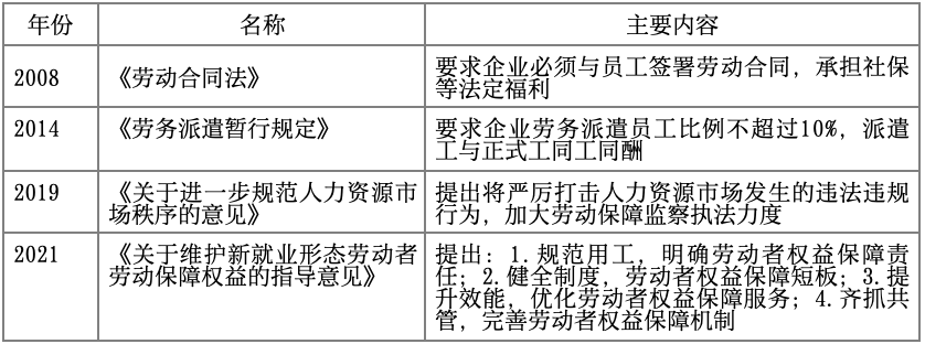 其中最主要的政策是,2014年人社部开始实施的《劳务派遣暂行规定》。这份规定要求企业将派遣工人数压缩至工人总数10%以内,并且实现同工同酬。但是法规条文中却为企业将派遣工转换为外包工留了后门(来源)。同工同酬条款也无实质保障。除了刚实施的一两年,部分企业为了将派遣工转换为外包工付出了一些成本以外,后续临时工的使用更加滥用,10%的人数上限已经形同虚设。