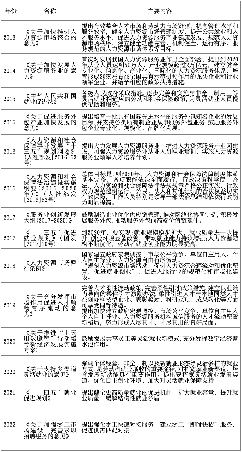 甚至,在疫情来临后的近几年。面对经济减速、失业增加的情况,为了进一步帮助企业减轻用人成本,国家反而不再追求稳定雇佣、限制非正式用工,而是相反地推出了更多鼓励灵活就业的政策以及相应的鼓励发展人力资源机构的政策(见后文附件1)。
