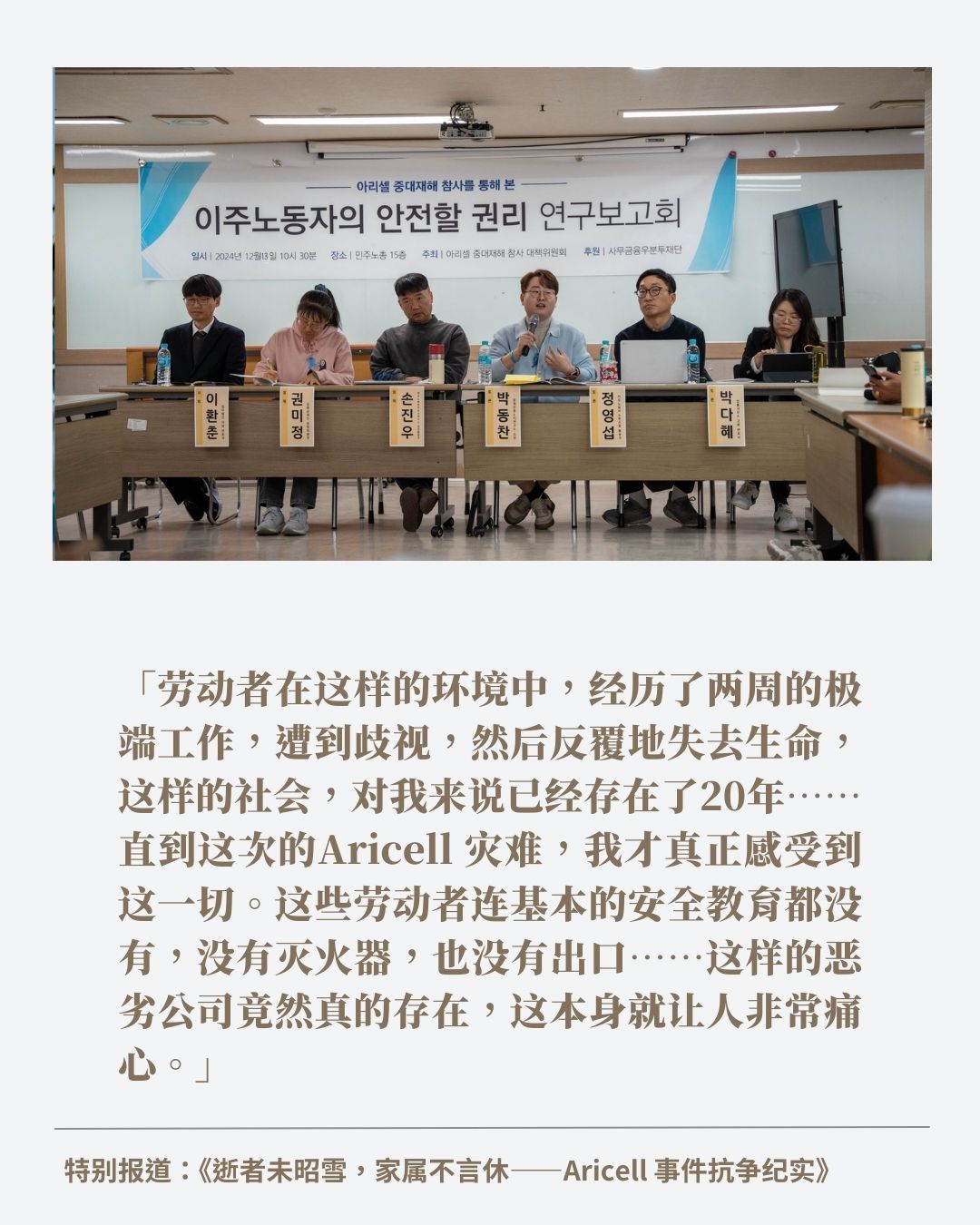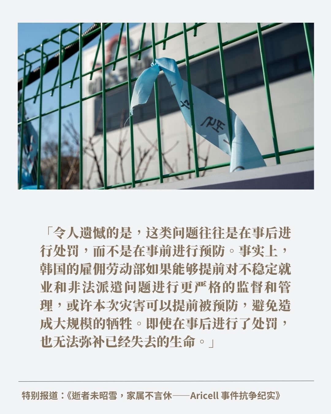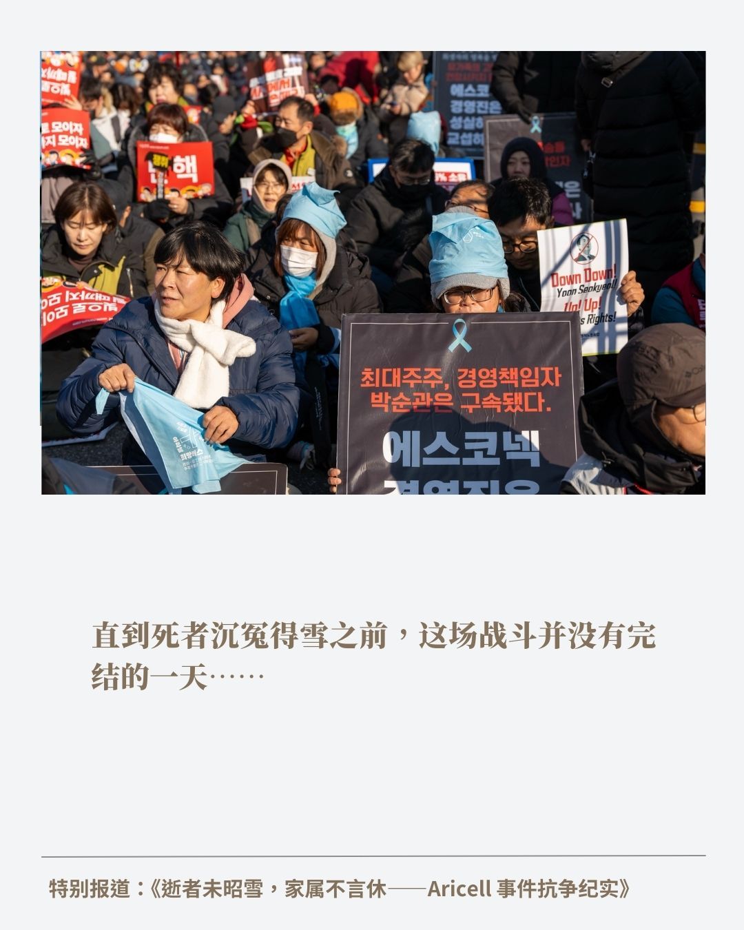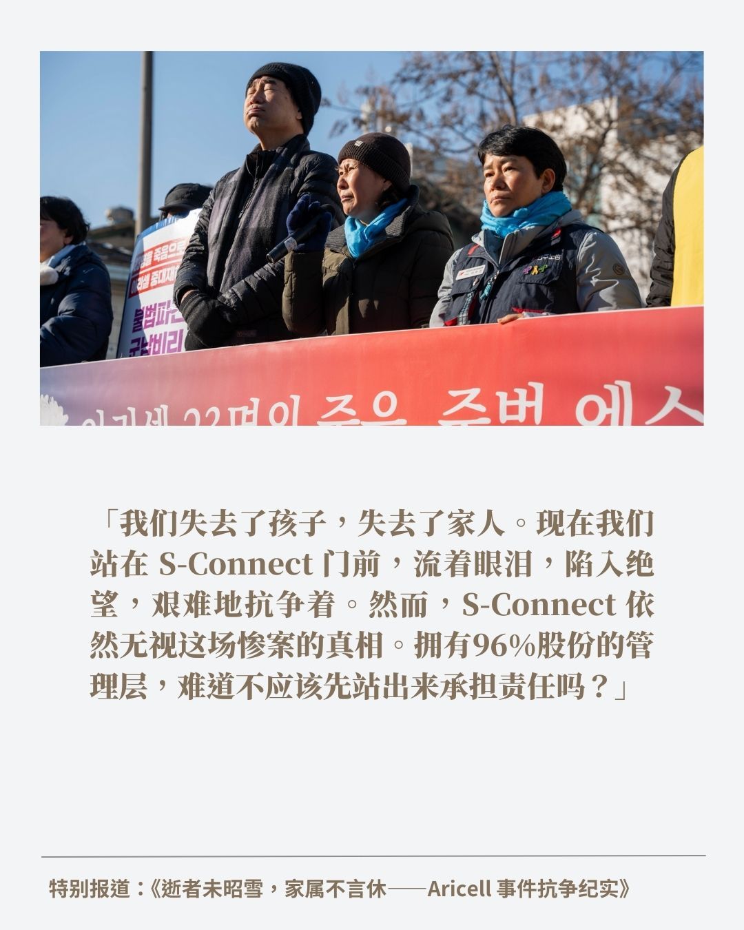 编按:2024年6月24日清晨,韩国京畿道华城市的Aricell锂电池工厂突发火灾,火势在短短数秒内吞噬了整层生产车间,造成23名工人死亡、8人受伤。死者中,18人为非韩国籍移住劳动者,包括17名中国籍与1名老挝籍工人。这是韩国历史上最严重的移工为主的重大产业事故。火灾当下,事件获得了国际等级的媒体关注。然而后续的维权之路却并不顺利,家属们至今尚未得到公司的正式道歉与赔偿。 如今,时间已经来到2025年,时间已经过去将近200天,这场灾难的受害者家属们仍在寒风中为正义发声。企业、政府的冷漠以及逐渐淡去的公众关注,使这场维权之路愈显孤独与艰难。在京畿道广州市S-Connect总部外搭建的抗议帐…